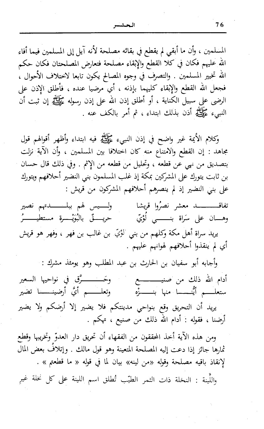 إِنَّ الْقَطْعَ وَالِامْتِنَاعَ مِنْهُ كَانَ اخْتِلَافًا بَيْنَ الْمُسْلِمِينَ، وَأَنَّ الْآيَةَ نَزَلَتْ بِتَصْدِيقِ مَنْ نَهَى عَنْ قَطْعِهِ، وَتَحْلِيلِ مَنْ قَطَعَهُ مِنَ الْإِثْمِ. وَفِي ذَلِكَ قَالَ حَسَّانُ بْنُ ثَابِتٍ يَتَوَرَّكُ عَلَى الْمُشْرِكِينَ بِمَكَّةَ إِذْ غَلَبَ الْمُسْلِمُونَ بَنِي النَّضِيرِ أَحْلَافَهُمْ وَيَتَوَرَّكُ عَلَى بَنِي النَّضِيرِ إِذْ لَمْ يَنْصُرْهُمْ أَحْلَافُهُمُ الْمُشْرِكُونَ مِنْ قُرَيْشٍ: