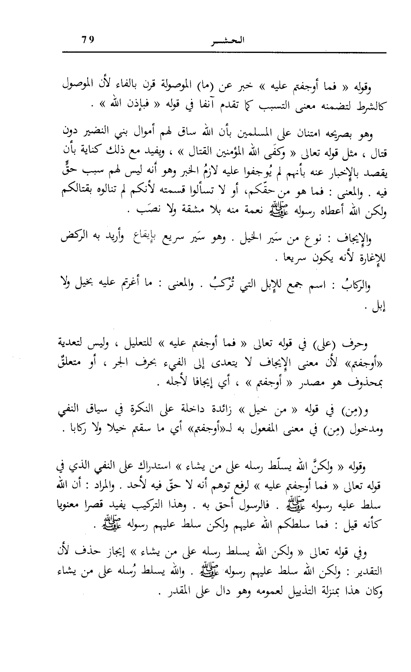 وَحَرْفُ (عَلَى) فِي قَوْلِهِ تَعَالَى: فَما أَوْجَفْتُمْ عَلَيْهِ لِلتَّعْلِيلِ، وَلَيْسَ لِتَعْدِيَةِ أَوْجَفْتُمْ لَأَنَّ مَعْنَى الْإِيجَافِ لَا يَتَعَدَّى إِلَى الْفَيْءِ بِحَرْفِ الْجَرِّ، أَوْ مُتَعَلِّقٌ بِمَحْذُوفٍ هُوَ مَصْدَرُ أَوْجَفْتُمْ، أَيْ إِيجَافًا لِأَجْلِهِ.