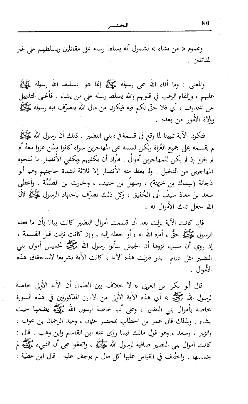 قَالَ أَبُو بَكْرُ ابْن الْعَرَبِيِّ: «لَا خِلَافَ بَيْنَ الْعُلَمَاءِ أَنَّ الْآيَةَ الْأُولَى خَاصَّةٌ لرَسُول الله صَلَّى اللهُ عَلَيْهِ وَسَلَّمَ» أَيْ هَذِهِ الْآيَةُ الْأُولَى مِنَ الْآيَتَيْنِ الْمَذْكُورَتَيْنِ فِي هَذِهِ السُّورَةِ خَاصَّةٌ بِأَمْوَالِ بَنِي النَّضِيرِ، وَعَلَى أَنَّهَا خَاصَّةٌ لرَسُول الله صَلَّى اللهُ عَلَيْهِ وَسَلَّمَ يَضَعُهَا حَيْثُ يَشَاءُ. وَبِذَلِكَ قَالَ عُمَرُ بْنُ الْخَطَّابِ بِمَحْضِرِ عُثْمَان، وَعبد الرحمان بْنِ عَوْفٍ، وَالزُّبَيْرِ، وَسَعْدٍ، وَهُوَ قَوْلُ مَالِكٍ فِيمَا