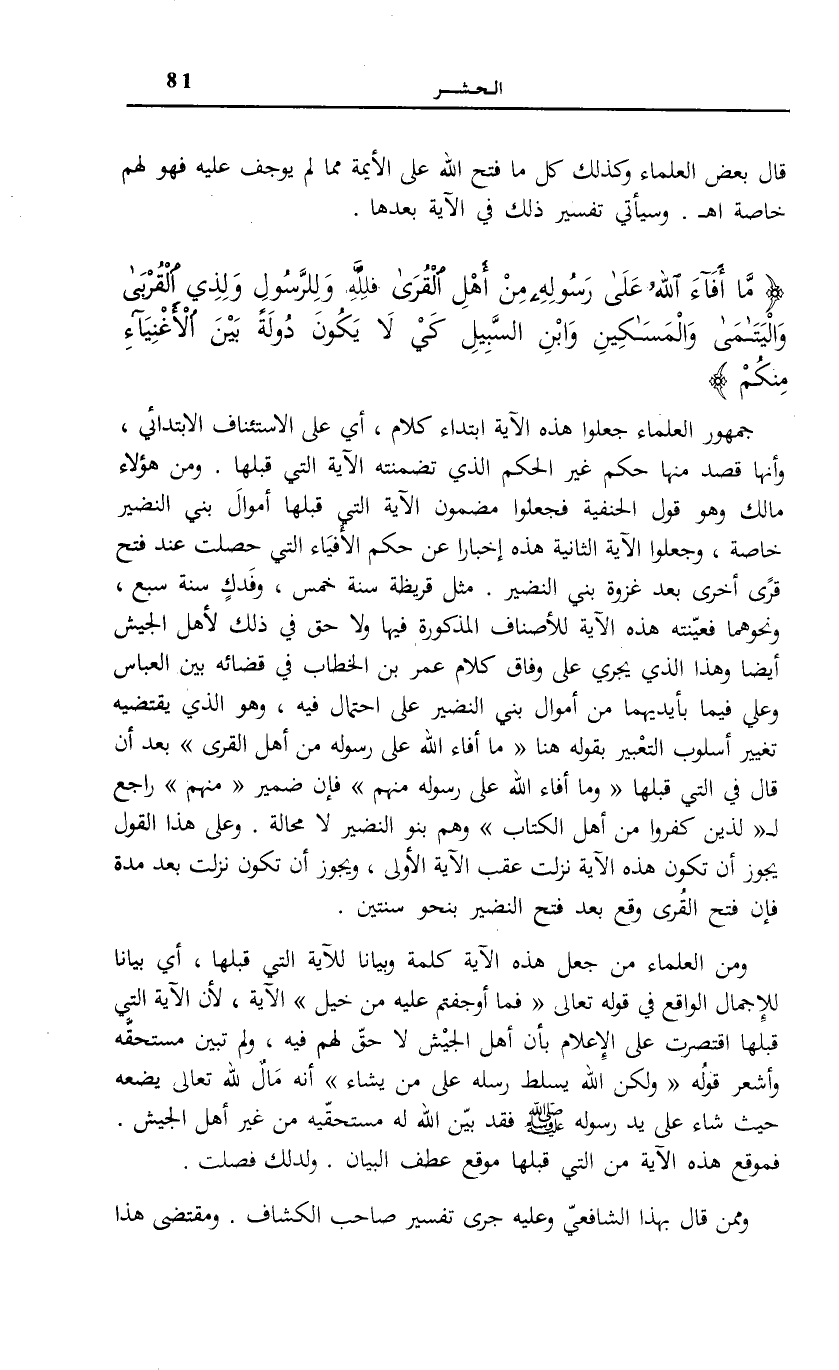 مَا أَفاءَ اللَّهُ عَلى رَسُولِهِ مِنْ أَهْلِ الْقُرى فَلِلَّهِ وَلِلرَّسُولِ وَلِذِي الْقُرْبى وَالْيَتامى وَالْمَساكِينِ وَابْنِ السَّبِيلِ كَيْ لَا يَكُونَ دُولَةً بَيْنَ الْأَغْنِياءِ مِنْكُمْ.