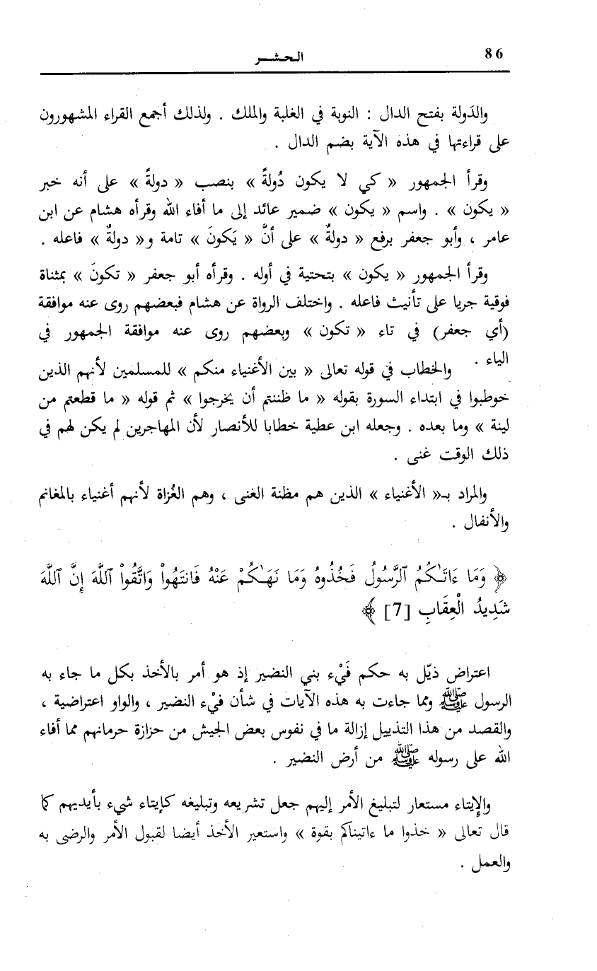 وَقَرَأَ الْجُمْهُورُ كَيْ لَا يَكُونَ دُولَةً بِنَصْبِ دُولَةً عَلَى أَنَّهُ خَبَرُ يَكُونَ. وَاسْمُ يَكُونَ ضَمِيرٌ عَائِدٌ إِلَى مَا أَفَاءَ اللَّهُ، وَقَرَأَهُ هِشَامٌ عَنِ ابْنِ عَامِرٍ، وَأَبُو جَعْفَرٍ بِرَفْعِ دُولَةٌ عَلَى أَنَّ يَكُونَ تَامَّةٌ ودولة فَاعِلُهُ.