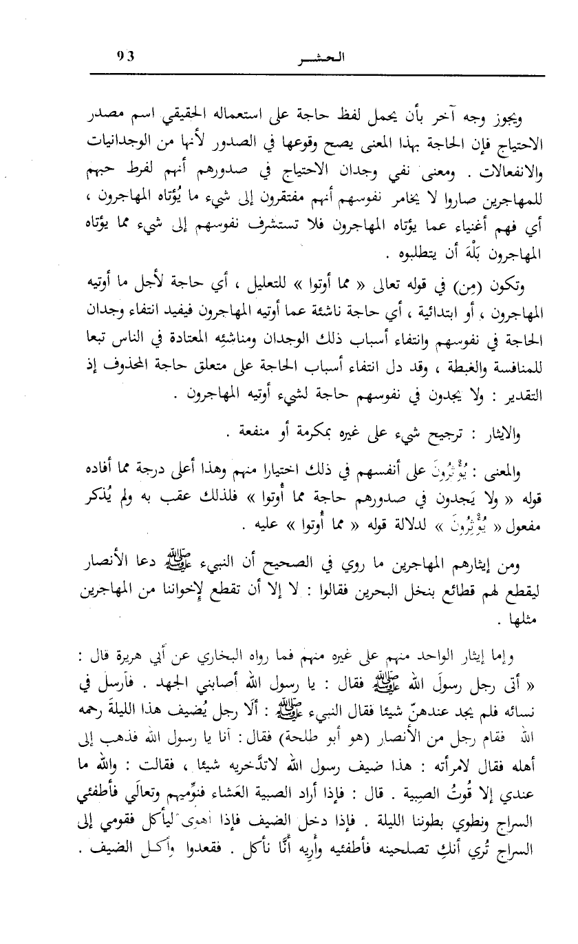 وَمَعْنَى نَفْيِ وُجْدَانِ الِاحْتِيَاجِ فِي صُدُورِهِمْ أَنَّهُمْ لِفَرْطِ حُبِّهِمْ لِلْمُهَاجِرِينَ صَارُوا لَا يُخَامِرُ نُفُوسَهُمْ أَنَّهُمْ مُفْتَقِرُونَ إِلَى شَيْءٍ مِمَّا يُؤْتَاهُ الْمُهَاجِرُونَ، أَي فهم أَغْنِيَاء عَمَّا يؤتاه الْمُهَاجِرُونَ فَلَا تستشرف نُفُوسهم إِلَى شَيْء مِمَّا يؤتاه الْمُهَاجِرُونَ بَلْهَ أَنْ يَتَطَلَّبُوهُ.
