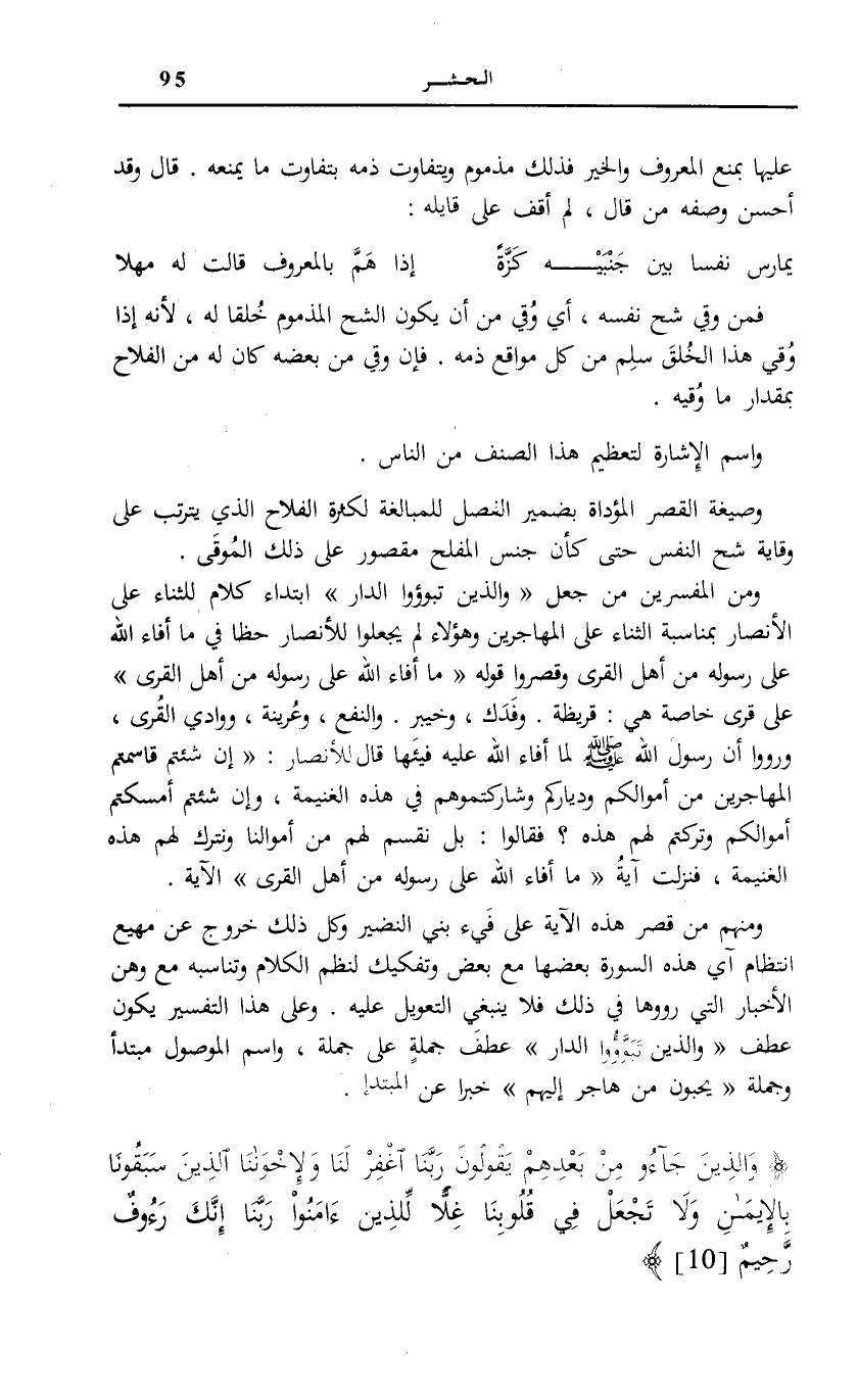 وَمِنْهُمْ مَنْ قَصَرَ هَذِهِ الْآيَةَ عَلَى فَيْءِ بَنِي النَّضِيرِ وَكُلُّ ذَلِكَ خُرُوجٌ عَنْ مَهْيَعِ انْتِظَامِ آيِ هَذِهِ السُّورَةِ بَعْضِهَا مَعَ بَعْضٍ وَتَفْكِيكٌ لِنَظْمِ الْكَلَامِ وَتَنَاسُبِهِ مَعَ وَهْنِ الْأَخْبَارِ الَّتِي رَوَوْهَا فِي ذَلِكَ فَلَا يَنْبَغِي التَّعْوِيلُ عَلَيْهِ. وَعَلَى هَذَا التَّفْسِيرِ يَكُونُ عطف وَالَّذِينَ تَبَوَّؤُا الدَّارَ عَطْفَ جُمْلَةٍ عَلَى جُمْلَةٍ، وَاسْمُ الْمَوْصُولِ مُبْتَدَأً وَجُمْلَةُ يُحِبُّونَ مَنْ هاجَرَ إِلَيْهِمْ خَبَرًا عَن الْمُبْتَدَأ.