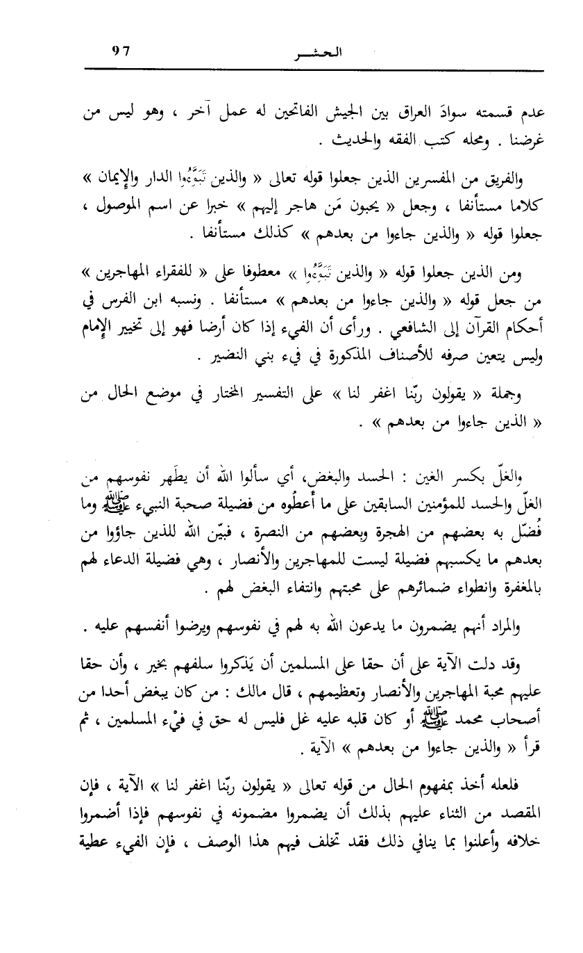 وَمِنَ الَّذِينَ جَعَلُوا قَوْله: وَالَّذِينَ تَبَوَّؤُا [الْحَشْر: 9] مَعْطُوفًا عَلَى لِلْفُقَراءِ الْمُهاجِرِينَ [الْحَشْر: 8] مَنْ جَعَلَ قَوْله: وَالَّذِينَ جاؤُ مِنْ بَعْدِهِمْ مُسْتَأْنَفًا. وَنَسَبَهُ ابْنُ الْفَرَسِ فِي «أَحْكَامِ الْقُرْآنِ» إِلَى الشَّافِعِيِّ. وَرَأَى أَنَّ الْفَيْءَ إِذَا كَانَ أَرْضًا فَهُوَ إِلَى تَخْيِيرِ الْإِمَامِ وَلَيْسَ يَتَعَيَّنُ صَرْفُهُ لِلْأَصْنَافِ الْمَذْكُورَةِ فِي فَيْءِ بَنِي النَّضِيرِ.