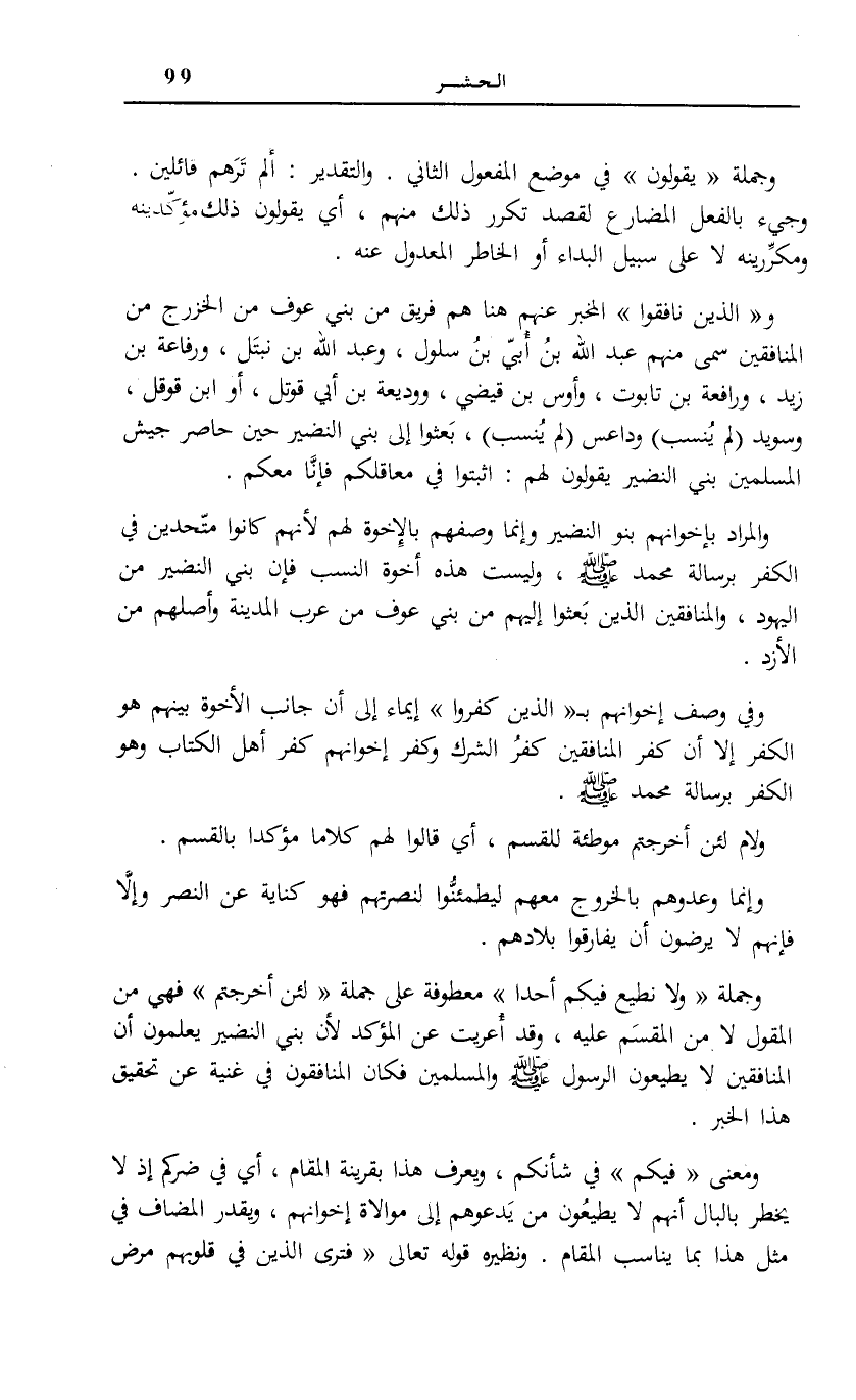 وَالْمُرَادُ بِإِخْوَانِهِمْ بَنُو النَّضِيرِ وَإِنَّمَا وَصَفَهُمْ بِالْإِخُوَّةِ لَهُمْ لِأَنَّهُمَ كَانُوا مُتَّحِدِينَ فِي الْكُفْرِ برسالة مُحَمَّد صَلَّى اللهُ عَلَيْهِ وَسَلَّمَ، وَلَيْسَتْ هَذِهِ أُخُوَّةَ النَّسَبِ فَإِنَّ بَنِي النَّضِيرِ مِنَ الْيَهُودِ، وَالْمُنَافِقِينَ