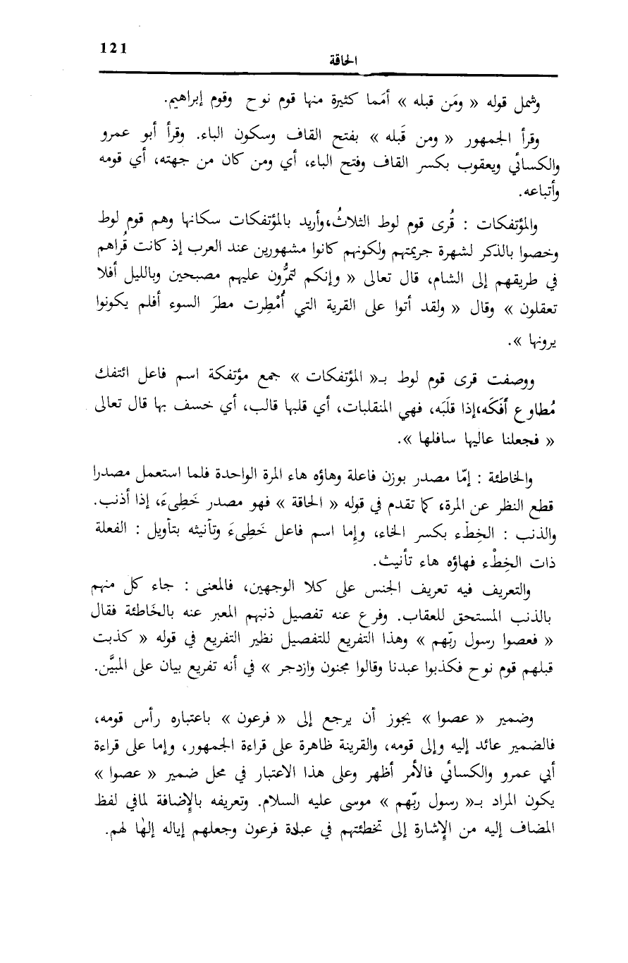 والْمُؤْتَفِكاتُ: قُرَى لُوطٍ الثَّلَاثُ، وَأُرِيدَ بِالْمُؤْتَفِكَاتِ سُكَّانُهَا وَهُمْ قَوْمُ لُوطٍ وَخُصُّوا بِالذِّكْرِ لِشُهْرَةِ جَرِيمَتِهِمْ وَلِكَوْنِهِمْ كَانُوا مَشْهُورِينَ عِنْدَ الْعَرَبِ إِذْ كَانَتْ قُرَاهُمْ فِي طَرِيقِهِمْ إِلَى الشَّامِ، قَالَ تَعَالَى: وَإِنَّكُمْ لَتَمُرُّونَ عَلَيْهِمْ مُصْبِحِينَ وَبِاللَّيْلِ أَفَلا تَعْقِلُونَ