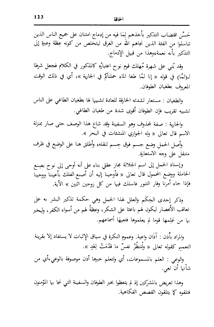 وَذُكِرَ إِحْدَى الْحِكَمِ وَالْعِلَلِ لِهَذَا الْحَمْلِ وَهِيَ حِكْمَةُ تَذْكِيرِ الْبَشَرِ بِهِ عَلَى تَعَاقُبِ الْأَعْصَارِ لِيَكُونَ لَهُمْ بَاعِثًا عَلَى الشُّكْرِ، وَعِظَةً لَهُمْ مِنْ أَسَوَاءِ الْكُفْرِ، وَلِيُخْبِرَ بِهَا مَنْ عَلِمَهَا قَوْمًا لَمْ يَعْلَمُوهَا فَتَعِيهَا أسماعهم.