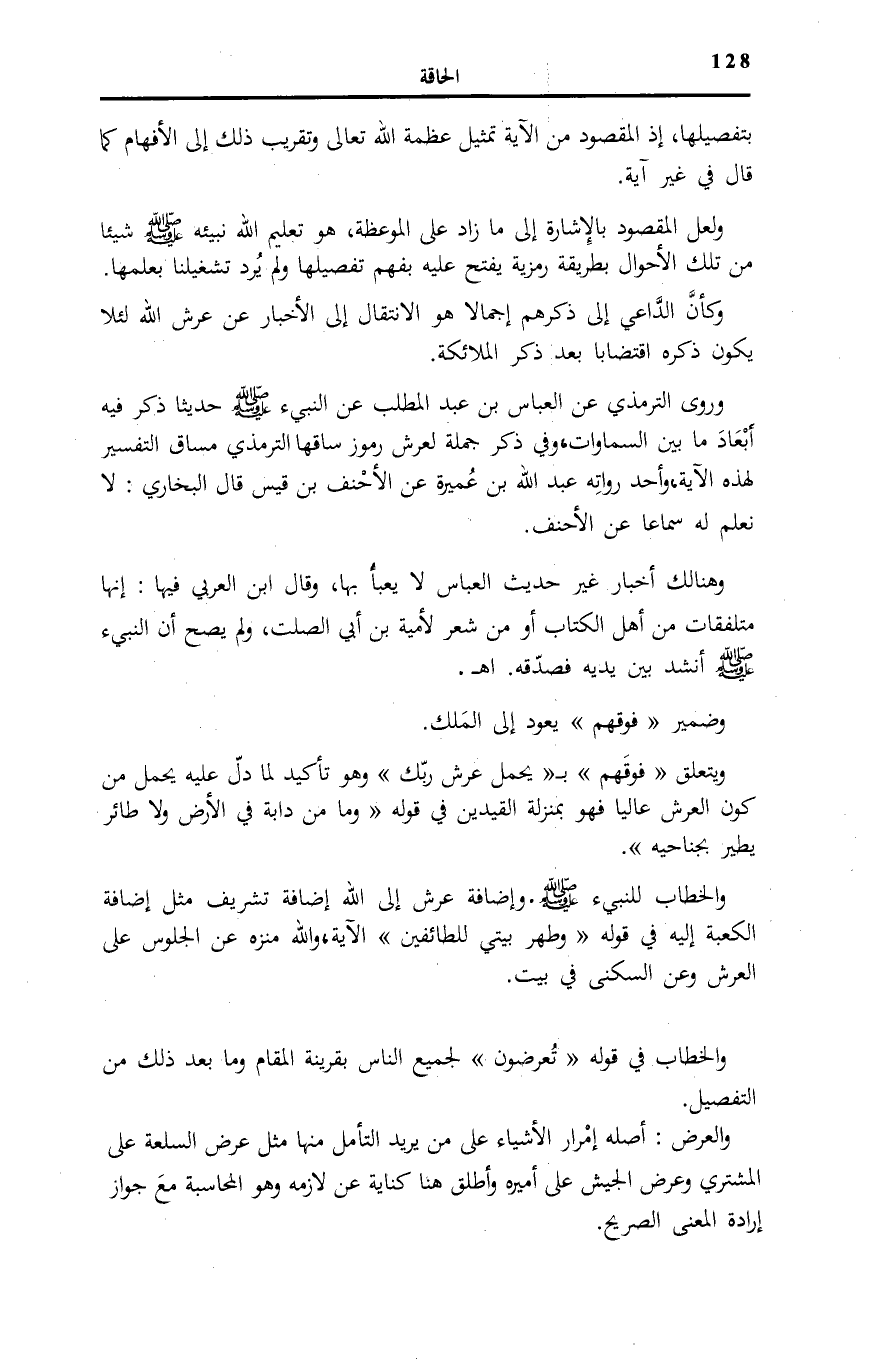 وَرَوَى التِّرْمِذِيُّ عَنِ الْعَبَّاسِ بْنِ عَبْدِ الْمُطَّلِبِ عَنِ النَّبِيءِ صَلَّى اللهُ عَلَيْهِ وَسَلَّمَ حَدِيثًا ذَكَرَ فِيهِ أَبْعَادَ مَا بَيْنَ السَّمَاوَاتِ، وَفِي ذكر حَملَة الْعَرْشِ رُمُوزٌ سَاقَهَا التِّرْمِذِيُّ مَسَاقَ التَّفْسِيرِ لِهَذِهِ الْآيَةِ، وَأَحَدُ رُوَاتِهِ عَبْدُ اللَّهِ بْنُ عُمَيْرَةَ عَنِ الْأَحْنَفِ بْنِ قَيْسٍ قَالَ الْبُخَارِيُّ: لَا نَعْلَمُ لَهُ سَمَاعًا عَنِ الْأَحْنَفِ.