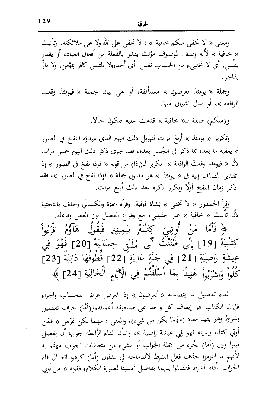 وَمَعْنَى لَا تَخْفى مِنْكُمْ خافِيَةٌ: لَا تَخْفَى عَلَى اللَّهِ وَلَا عَلَى مَلَائِكَتِهِ. وَتَأْنِيثُ خافِيَةٌ لِأَنَّهُ وَصْفٌ لِمَوْصُوفٍ مُؤَنَّثٍ يُقَدَّرُ بِالْفَعْلَةِ مِنْ أَفْعَالِ الْعِبَادِ، أَوْ يُقَدَّرُ بِنَفْسٍ، أَيْ لَا تَخْتَبِئُ مِنَ الْحِسَابِ نَفْسُ أَيِّ أَحَدٍ، وَلَا يَلْتَبِسُ كَافِرٌ بِمُؤْمِنٍ، وَلَا بَارٌّ بِفَاجِرٍ.