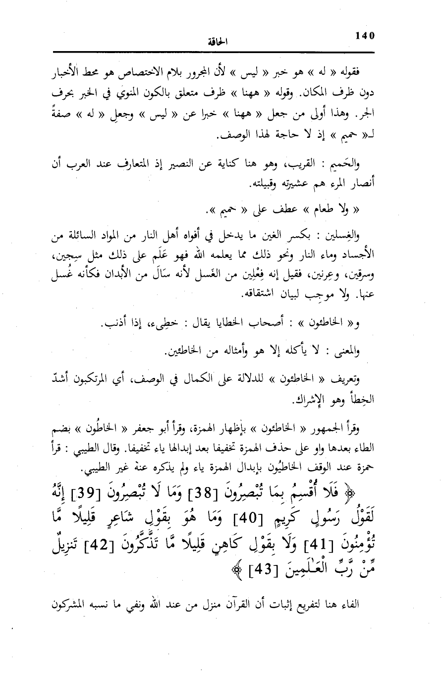 فَقَوْلُهُ لَهُ هُوَ خبر فَلَيْسَ لِأَنَّ الْمَجْرُورَ بِلَامِ الْاخْتِصَاصِ هُوَ مَحَطُّ الْإِخْبَارِ دُونَ ظَرْفِ الْمَكَانِ. وَقَوْلُهُ: هاهُنا ظَرْفٌ مُتَعَلِّقٌ بِالْكَوْنِ الْمَنْوِيِّ فِي الْخَبَرِ بِحَرْفِ الْجَرِّ. وَهَذَا أَوْلَى مِنْ جَعْلِ هاهُنا خَبرا عَن فَلَيْسَ وَجَعْلِ لَهُ صِفَةً لِ حَمِيمٌ إِذْ لَا حَاجَةَ لِهَذَا الْوَصْفِ.