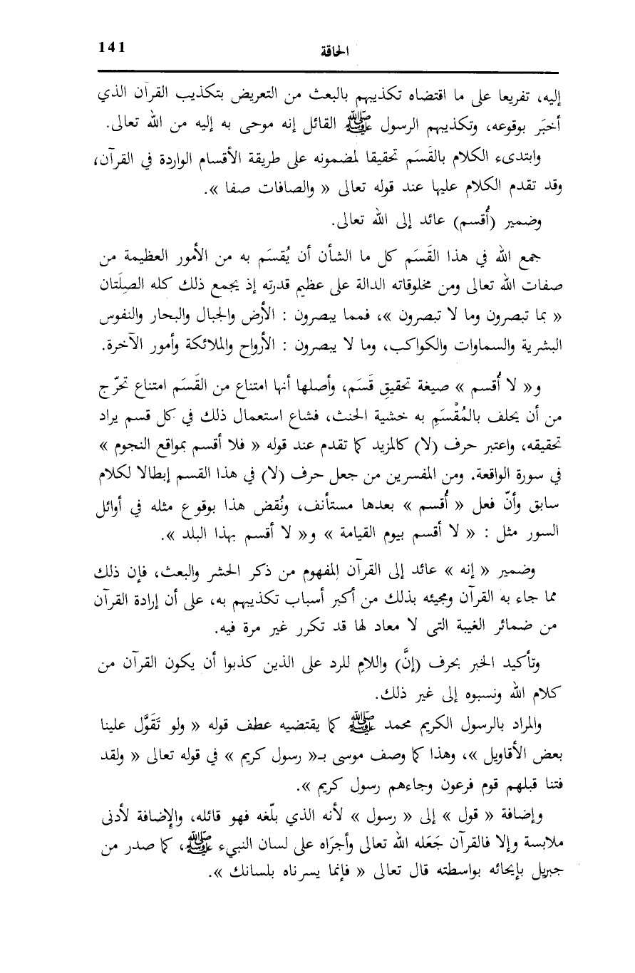 وَلَا أُقْسِمُ صِيغَةُ تَحْقِيقِ قِسْمٍ، وَأَصْلُهَا أَنَّهَا امْتِنَاعٌ مِنَ الْقَسَمِ امْتِنَاعَ تَحَرُّجٍ مِنْ أَنْ يَحْلِفَ بِالْمُقْسَمِ بِهِ خَشْيَةَ الْحِنْثِ، فَشَاعَ اسْتِعْمَالُ ذَلِكَ فِي كُلِّ قَسَمٍ يُرَادُ تَحْقِيقُهُ، وَاعْتُبِرَ حَرْفُ (لَا) كَالْمَزِيدِ كَمَا تَقَدَّمَ عِنْدَ قَوْلِهِ: فَلا أُقْسِمُ بِمَواقِعِ النُّجُومِ فِي سُورَةِ الْوَاقِعَةِ [75] ، وَمِنَ الْمُفَسِّرِينَ مَنْ جَعَلَ حَرْفُ (لَا) فِي هَذَا الْقَسَمِ إِبْطَالًا لِكَلَامٍ سَابِقٍ وَأَنَّ فِعْلَ أُقْسِمُ بَعْدَهَا مُسْتَأْنَفٌ، وَنقض هَذَا النَّوْع بِوُقُوعِ مِثْلِهِ فِي أَوَائِلِ السُّورِ مِثْلُ: لَا أُقْسِمُ بِيَوْمِ الْقِيامَةِ [الْقِيَامَةِ: 1] وَلَا أُقْسِمُ بِهذَا الْبَلَدِ [الْبَلَدِ: 1] .