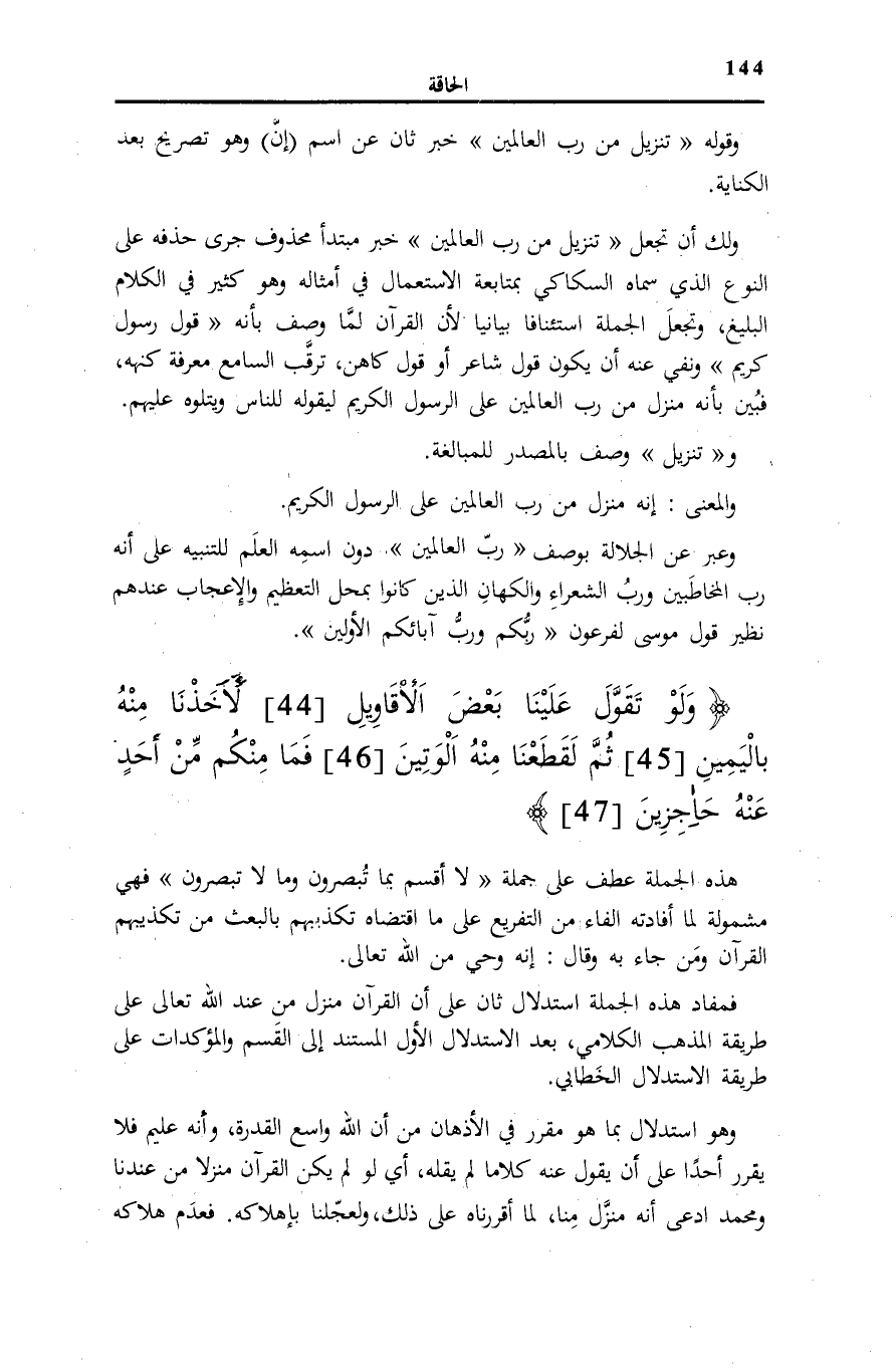 وَهُوَ اسْتِدْلَالٌ بِمَا هُوَ مُقَرَّرٌ فِي الْأَذْهَانِ مِنْ أَنَّ اللَّهَ وَاسِعُ الْقُدْرَةِ، وَأَنَّهُ عَلِيمٌ فَلَا يُقَرِّرُ أَحَدًا عَلَى أَنْ يَقُولَ عَنْهُ كَلَامًا لَمْ يَقُلْهُ، أَيْ لَوْ لَمْ يَكُنِ الْقُرْآنُ مُنَزَّلًا مِنْ عِنْدِنَا وَمُحَمَّدٌ ادَّعَى أَنَّهُ مُنَزَّلٌ مِنَّا، لَمَا أَقْرَرْنَاهُ عَلَى ذَلِكَ، وَلَعَجَّلْنَا بِإِهْلَاكِهِ. فَعَدَمُ هَلَاكِهِ صَلَّى اللهُ عَلَيْهِ وَسَلَّمَ