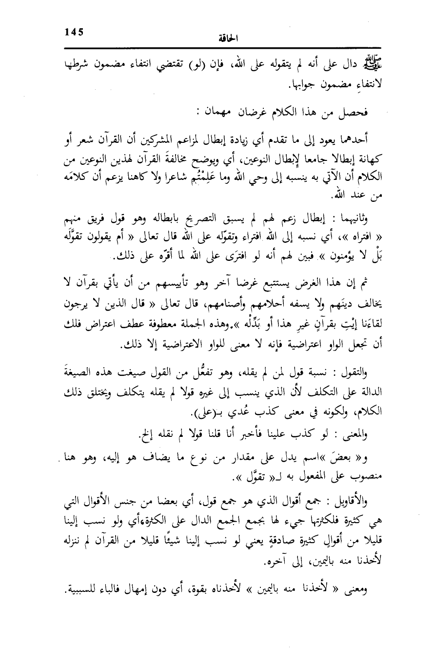 دَالٌّ عَلَى أَنَّهُ لَمْ يَتَقَوَّلْهُ عَلَى اللَّهِ، فَإِنَّ لَوْ تَقْتَضِي انْتِفَاءَ مَضْمُونِ شَرْطِهَا لِانْتِفَاءِ مَضْمُونِ جَوَابِهَا.