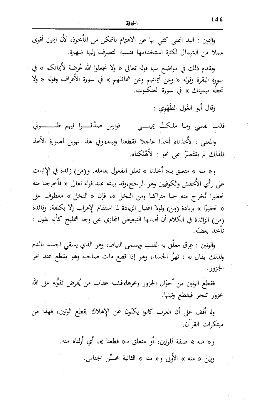 وَلَمْ أَقِفْ عَلَى أَنَّ الْعَرَبَ كَانُوا يُكَنُّونَ عَنِ الْإِهْلَاكِ بِقَطْعِ الْوَتِينِ، فَهَذَا مِنْ مُبْتَكَرَاتِ الْقُرْآنِ.