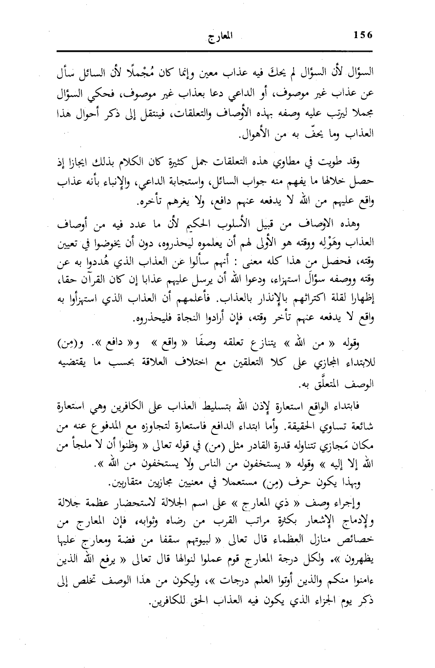 السُّؤَالِ لِأَنَّ السُّؤَالَ لَمْ يُحْكَ فِيهِ عَذَابٌ مُعَيَّنٌ وَإِنَّمَا كَانَ مُجْمَلًا لِأَنَّ السَّائِلَ سَأَلَ عَنْ عَذَابٍ غَيْرِ مَوْصُوفٍ، أَوِ الدَّاعِي دَعَا بِعَذَابٍ غَيْرِ مَوْصُوفٍ، فَحُكِيَ السُّؤَالُ مُجْمَلًا لِيُرَتَّبَ عَلَيْهِ وَصْفُهُ بِهَذِهِ الْأَوْصَافِ وَالتَّعْلِقَاتِ، فَيَنْتَقِلَ إِلَى ذِكْرِ أَحْوَالِ هَذَا الْعَذَابِ وَمَا يَحُفُّ بِهِ مِنَ الْأَهْوَالِ.