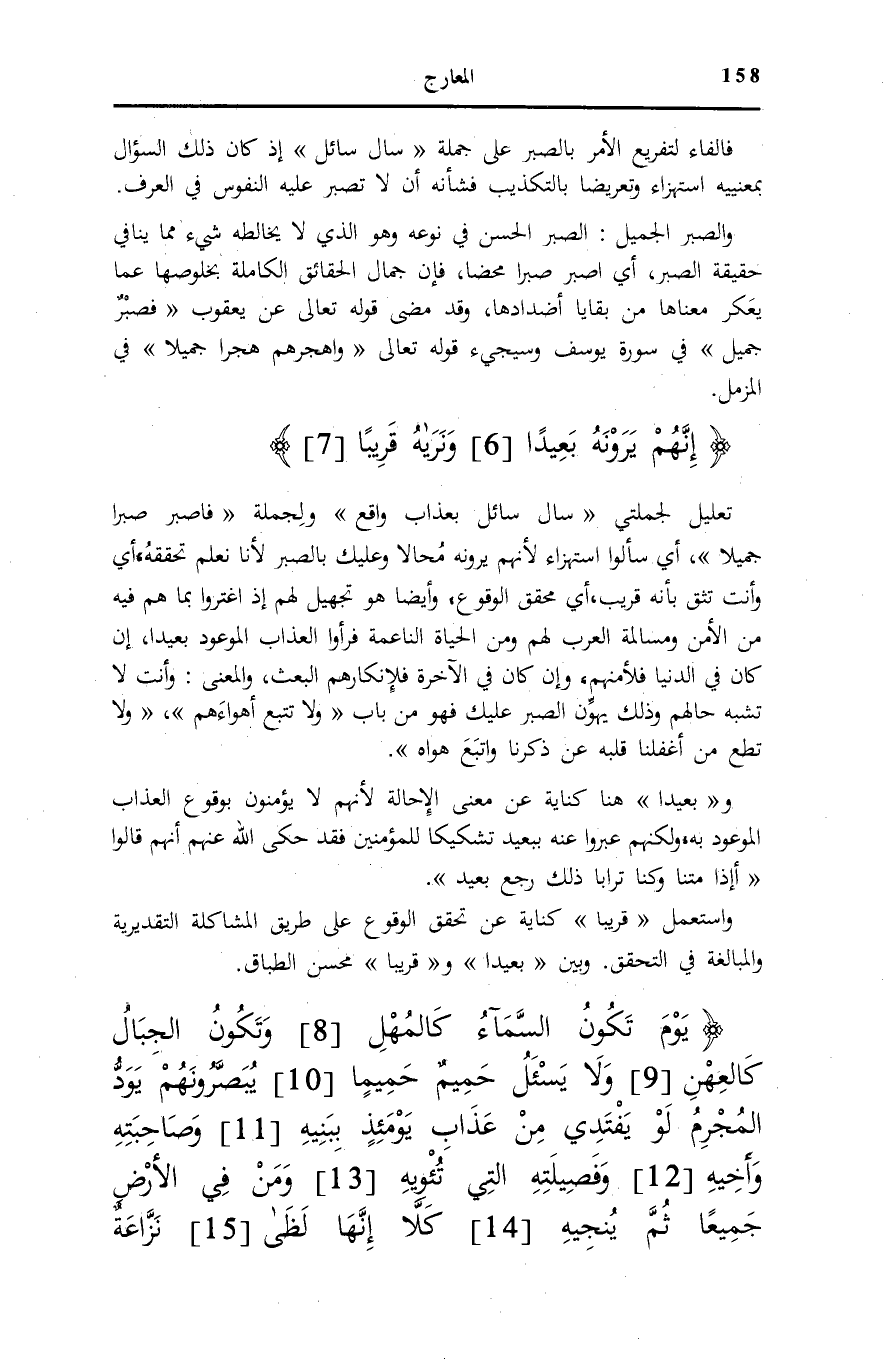 تَعْلِيلٌ لِجُمْلَتَيْ سَأَلَ سائِلٌ بِعَذابٍ واقِعٍ [المعارج: 1] وَلِجُمْلَةِ فَاصْبِرْ صَبْراً جَمِيلًا [المعارج: 5] ، أَيْ سَأَلُوا اسْتِهْزَاءً لِأَنَّهُمْ يَرَوْنَهُ مُحَالًا وَعَلَيْكَ بِالصَّبْرِ لِأَنَّا نَعْلَمُ تَحَقُّقَهُ، أَيْ وَأَنْتَ تَثِقُ بِأَنَّهُ قَرِيبٌ، أَيْ مُحَقَّقُ الْوُقُوعِ، وَأَيْضًا هُوَ تَجْهِيلٌ لَهُمْ إِذِ اغْتَرُّوا بِمَا هُمْ فِيهِ مِنَ الْأَمْنِ وَمُسَالَمَةِ الْعَرَبِ لَهُمْ وَمِنَ الْحَيَاةِ النَّاعِمَةِ فَرَأَوُا الْعَذَابَ الْمَوْعُودَ بَعِيدًا، إِنْ كَانَ فِي الدُّنْيَا فَلِأَمْنِهِمْ، وَإِنْ كَانَ فِي الْآخِرَةِ فَلِإِنْكَارِهِمُ الْبَعْثَ، وَالْمَعْنَى: وَأَنْتَ لَا تُشْبِهُ حَالَهُمْ