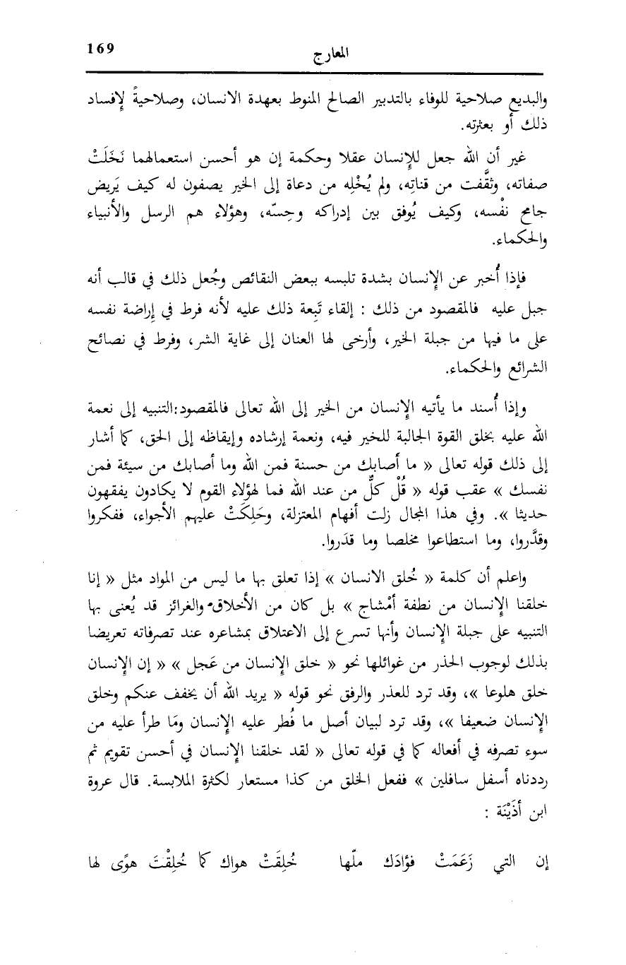 غَيْرَ أَنَّ اللَّهَ جَعَلَ لِلْإِنْسَانِ عَقْلًا وَحِكْمَةً إِنْ هُوَ أحسن استعمالهما نَخَلَتْ صِفَاتِهِ، وَثَقَّفَتْ مِنْ قَنَاتِهِ، وَلَمْ يُخْلِهِ مِنْ دُعَاةٍ إِلَى الْخَيْرِ يَصِفُونَ لَهُ كَيْفَ يَرِيضُ جَامِحَ نَفْسِهِ، وَكَيْفَ يُوَفِّقُ بَيْنَ إِدْرَاكِهِ وَحِسِّهِ، وَهَؤُلَاءِ هُمُ الرُّسُلُ وَالْأَنْبِيَاءُ وَالْحُكَمَاءُ.