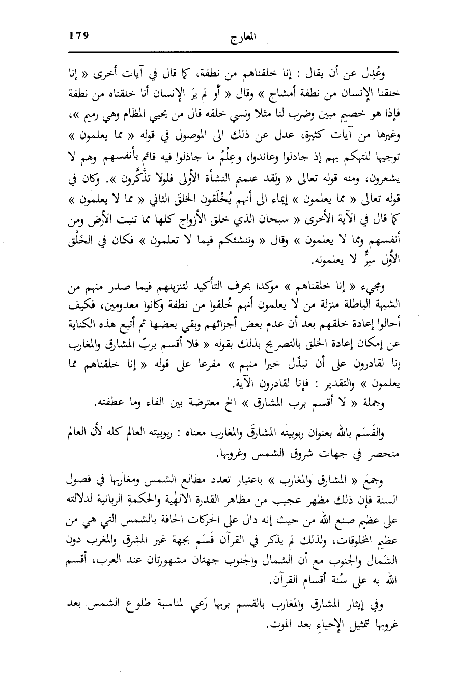وَجَمْعُ الْمَشارِقِ وَالْمَغارِبِ بِاعْتِبَارِ تَعَدُّدِ مَطَالِعِ الشَّمْسِ وَمَغَارِبِهَا فِي فُصُولِ السَّنَةِ فَإِنَّ ذَلِكَ مَظْهَرٌ عَجِيبٌ مِنْ مَظَاهِرِ الْقُدْرَةِ الْإِلَهِيَّةِ وَالْحِكْمَةِ الرَّبَّانِيَّةِ لِدَلَالَتِهِ عَلَى عَظِيمِ صُنْعِ اللَّهِ مِنْ حَيْثُ إِنَّهُ دَالٌّ عَلَى الْحَرَكَاتِ الْحَافَّةِ بِالشَّمْسِ الَّتِي هِيَ مِنْ عَظِيمِ الْمَخْلُوقَاتِ،