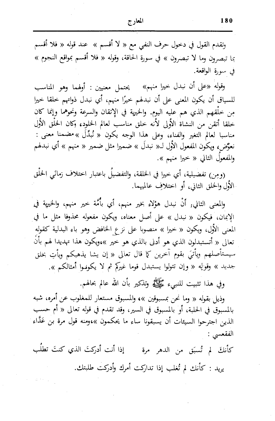 وَقَوْلُهُ: عَلى أَنْ نُبَدِّلَ خَيْراً مِنْهُمْ يَحْتَمِلُ مَعْنَيَيْنِ: أَوَّلَهُمَا وَهُوَ الْمُنَاسِبُ لِلسِّيَاقِ أَنْ يَكُونَ الْمَعْنَى عَلَى أَنْ نُبَدِّلَهُمْ خَيْرًا مِنْهُمْ، أَيْ نُبَدِّلُ ذَوَاتَهُمْ خَلْقًا خَيْرًا مِنْ خَلْقِهِمُ الَّذِي هُمْ عَلَيْهِ الْيَوْمَ. وَالْخَيْرِيَّةُ فِي الْإِتْقَانِ وَالسُّرْعَةِ وَنَحْوِهِمَا وَإِنَّمَا كَانَ خَلْقًا أُتْقِنَ مِنَ النَّشْأَةِ الْأُولَى لِأَنَّهُ خَلْقٌ مُنَاسِبٌ لِعَالَمِ الْخُلُودِ، وَكَانَ الْخَلْقُ الْأَوَّلُ مُنَاسِبًا لِعَالَمِ التَّغَيُّرِ وَالْفَنَاءِ، وَعَلَى هَذَا الْوَجْهِ يَكُونُ نُبَدِّلَ مُضَمَّنًا مَعْنَى: نُعَوِّضُ، وَيَكُونُ الْمَفْعُولُ الْأَوَّلُ لِ نُبَدِّلَ ضَمِيرًا مِثْلَ ضَمِيرِ مِنْهُمْ أَيْ نُبَدِّلُهُمْ وَالْمَفْعُولُ الثَّانِي خَيْراً مِنْهُمْ.