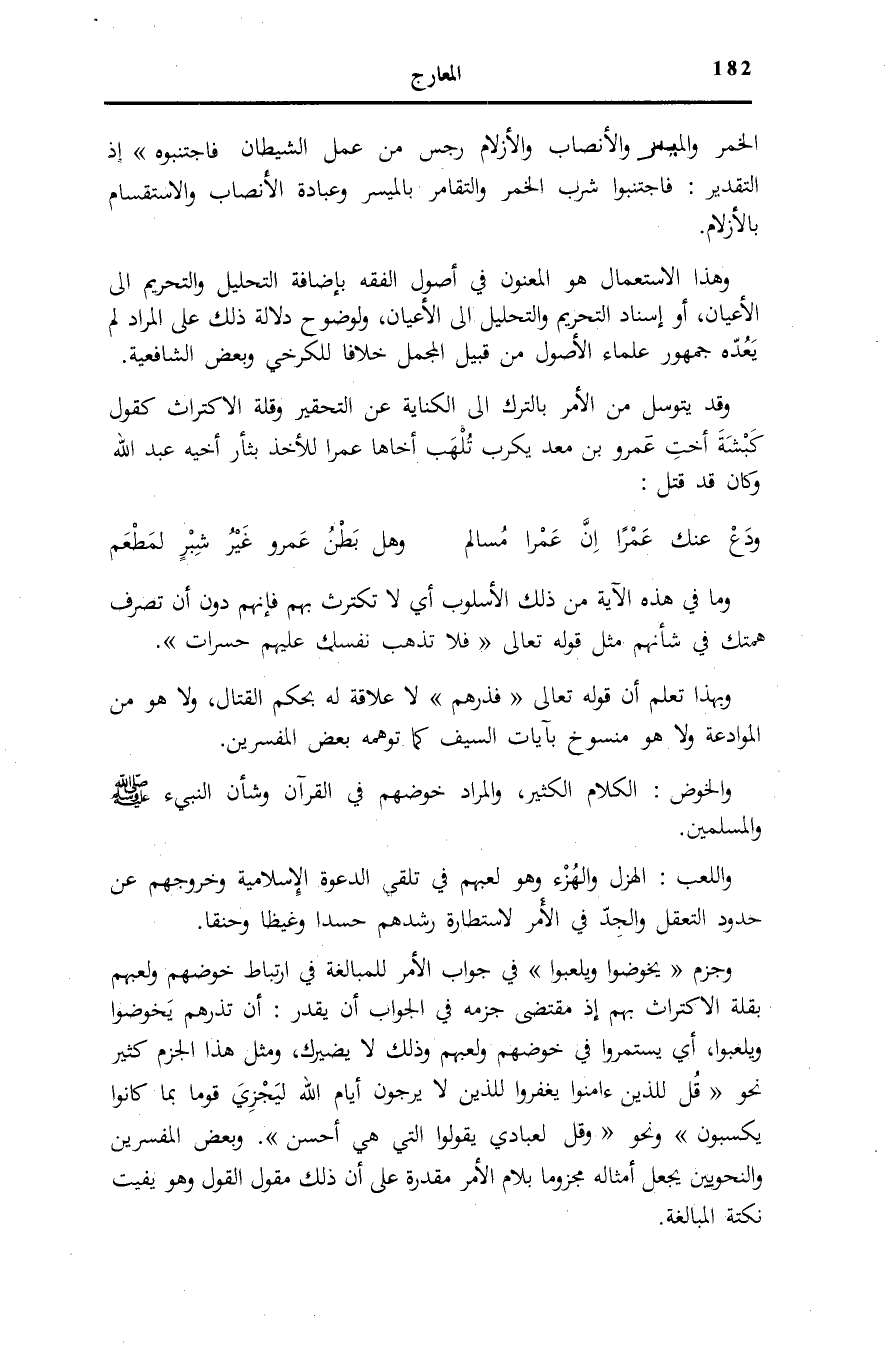 إِنَّمَا الْخَمْرُ وَالْمَيْسِرُ وَالْأَنْصابُ وَالْأَزْلامُ رِجْسٌ مِنْ عَمَلِ الشَّيْطانِ فَاجْتَنِبُوهُ [الْمَائِدَة: 90] إِذِ التَّقْدِيرُ: فَاجْتَنِبُوا شُرْبَ الْخَمْرِ وَالتَّقَامُرَ بِالْمَيْسِرِ وَعِبَادَةَ الْأَنْصَابِ وَالِاسْتِقْسَامَ بِالْأَزْلَامِ.