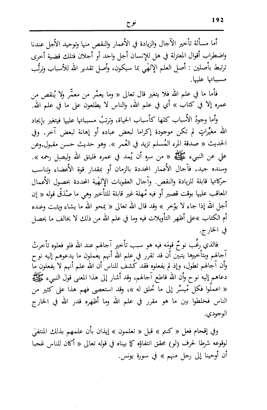أَمَّا مَسْأَلَةُ تَأْخِيرِ الْآجَالِ وَالزِّيَادَةِ فِي الْأَعْمَارِ وَالنَّقْصِ مِنْهَا وَتَوْحِيدِ الْأَجَلِ عِنْدَنَا وَاضْطِرَابِ أَقْوَالِ الْمُعْتَزِلَةِ فِي هَلْ لِلْإِنْسَانِ أَجَلٌ وَاحِدٌ أَوْ أَجَلَانِ فَتِلْكَ قَضِيَّةٌ أُخْرَى تَرْتَبِطُ بِأَصْلَيْنِ: أَصْلِ الْعِلْمِ الْإِلَهِيِّ بِمَا سَيَكُونُ، وَأَصْلِ تَقْدِيرِ اللَّهِ لِلْأَسْبَابِ وَتَرَتُّبِ مُسَبَّبَاتُهَا عَلَيْهَا.