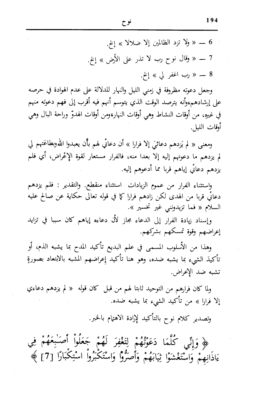 وَمَعْنَى فَلَمْ يَزِدْهُمْ دُعائِي إِلَّا فِراراً أَنَّ دُعَائِي لَهُمْ بِأَنْ يَعْبُدُوا اللَّهَ وَبِطَاعَتِهِمْ لِي لَمْ يَزِدْهُمْ مَا دَعَوْتُهُمْ إِلَيْهِ إِلَّا بُعْدًا مِنْهُ، فَالْفِرَارُ مُسْتَعَارٌ لِقُوَّةِ الْإِعْرَاضِ، أَيْ فَلَمْ يَزِدْهُمْ دُعَائِي إِيَّاهُمْ قُرْبًا مِمَّا أَدْعُوهُمْ إِلَيْهِ.