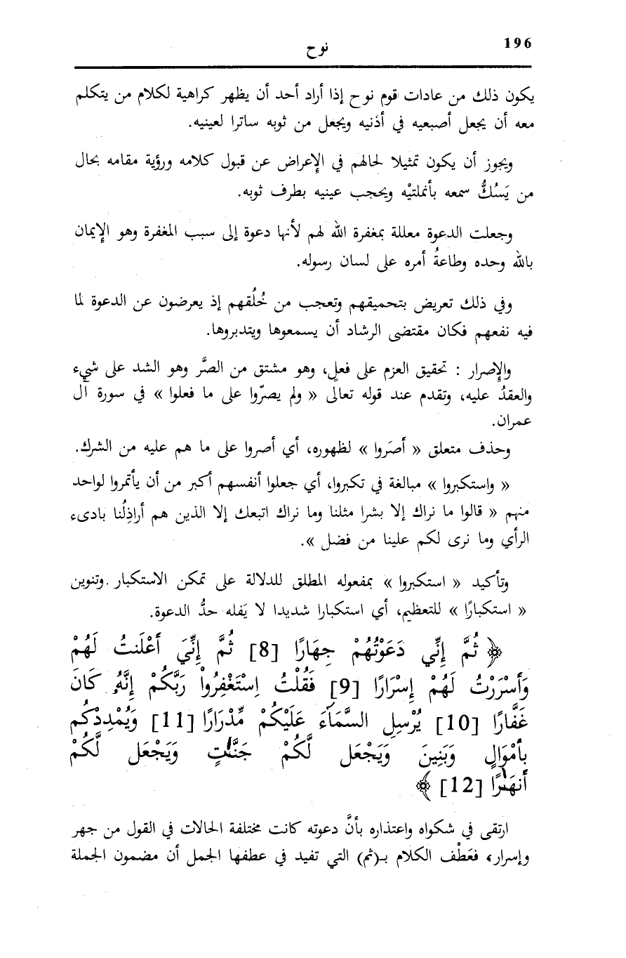 ثُمَّ إِنِّي دَعَوْتُهُمْ جِهاراً (8) ثُمَّ إِنِّي أَعْلَنْتُ لَهُمْ وَأَسْرَرْتُ لَهُمْ إِسْراراً (9) فَقُلْتُ اسْتَغْفِرُوا رَبَّكُمْ إِنَّهُ كانَ غَفَّاراً (10) يُرْسِلِ السَّماءَ عَلَيْكُمْ مِدْراراً (11) وَيُمْدِدْكُمْ بِأَمْوالٍ وَبَنِينَ وَيَجْعَلْ لَكُمْ جَنَّاتٍ وَيَجْعَلْ لَكُمْ أَنْهاراً (12)