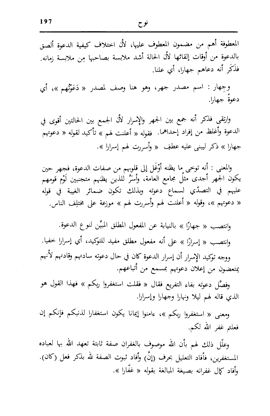وَالْمَعْنَى: أَنَّهُ تَوَخَّى مَا يَظُنُّهُ أَوْغَلَ إِلَى قُلُوبِهِمْ مِنْ صِفَاتِ الدَّعْوَةِ، فَجَهَرَ حِينَ يَكُونُ الْجَهْرُ أَجْدَى مِثْلَ مَجَامِعِ الْعَامَّةِ، وَأَسَرَّ لِلَّذِينَ يَظُنُّهُمْ مُتَجَنِّبِينَ لَوْمَ قَوْمِهِمْ عَلَيْهِمْ فِي التَّصَدِّي لِسَمَاعِ دَعْوَتِهِ وَبِذَلِكَ تَكُونُ ضَمَائِرُ الْغَيْبَةِ فِي قَوْلِهِ دَعَوْتُهُمْ، وَقَوْلِهِ: أَعْلَنْتُ لَهُمْ وَأَسْرَرْتُ لَهُمْ مُوَزَّعَةً عَلَى مُخْتَلَفِ النَّاسِ.