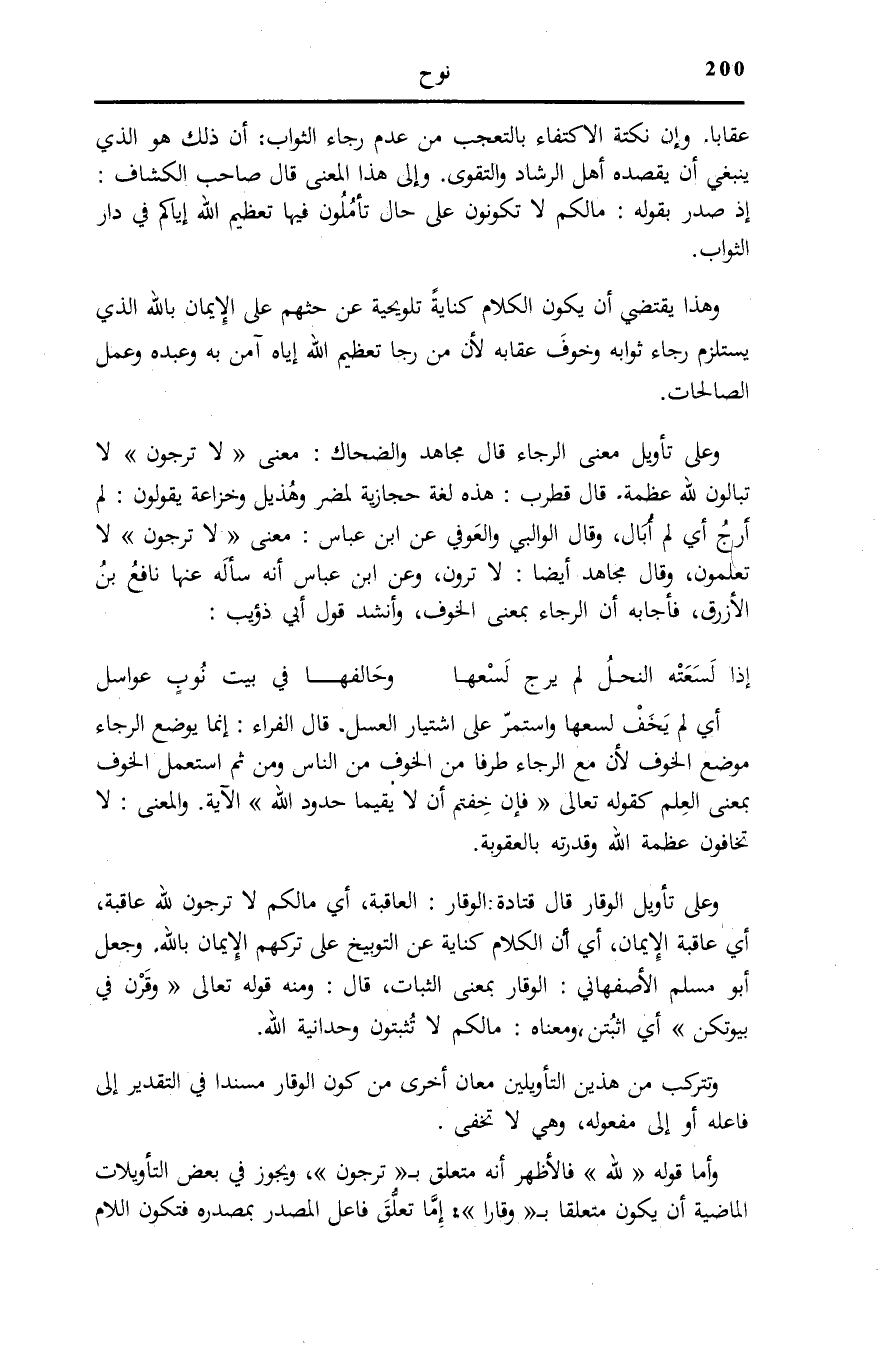 وَعَلَى تَأْوِيلِ مَعْنَى الرَّجَاءِ قَالَ مُجَاهِدٌ وَالضَّحَّاكُ: مَعْنَى لَا تَرْجُونَ لَا تُبَالُونَ لِلَّهِ عَظَمَةً، قَالَ قُطْرُبٌ: هَذِهِ لُغَةٌ حِجَازِيَّةٌ لِمُضَرَ وَهُذَيْلٍ وَخُزَاعَةَ يَقُولُونَ: لَمْ أَرْجُ أَيْ لَمْ أُبَالِ، وَقَالَ الْوَالِبِيُّ وَالْعَوْفِيُّ عَنِ ابْنِ عَبَّاسٍ: مَعْنَى لَا تَرْجُونَ لَا تَعْلَمُونَ، وَقَالَ مُجَاهِدٌ أَيْضًا: لَا تَرَوْنَ، وَعَنِ ابْنِ عَبَّاسٍ أَنَّهُ سَأَلَهُ عَنْهَا نَافِعُ بْنُ الْأَزْرَقِ، فَأَجَابَهُ أَنَّ الرَّجَاءَ بِمَعْنَى الْخَوْفِ، وَأَنْشَدَ قَوْلَ أَبِي ذُؤَيْبٍ: