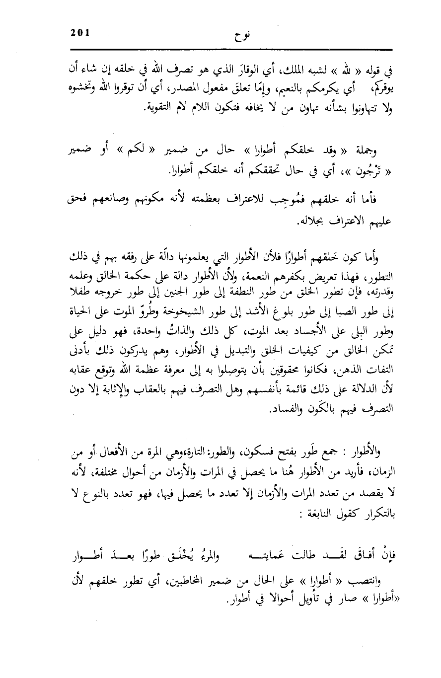 وَالْأَطْوَارُ: جَمْعُ طَوْرٍ بِفَتْحٍ فَسُكُونٍ، وَالطَّوْرُ: التَّارَةُ، وَهِيَ الْمَرَّةُ مِنَ الْأَفْعَالِ أَوْ مِنَ الزَّمَانِ، فَأُرِيدَ مِنَ الْأَطْوَارِ هُنَا مَا يَحْصُلُ فِي الْمَرَّاتِ وَالْأَزْمَانِ مِنْ أَحْوَالٍ مُخْتَلِفَةٍ، لِأَنَّهُ لَا يُقْصَدُ مِنْ تَعَدُّدِ الْمَرَّاتِ وَالْأَزْمَانِ إِلَّا تَعَدُّدُ مَا يَحْصُلُ فِيهَا، فَهُوَ تَعَدُّدٌ بِالنَّوْعِ لَا بِالتَّكْرَارِ كَقَوْلِ النَّابِغَةِ: