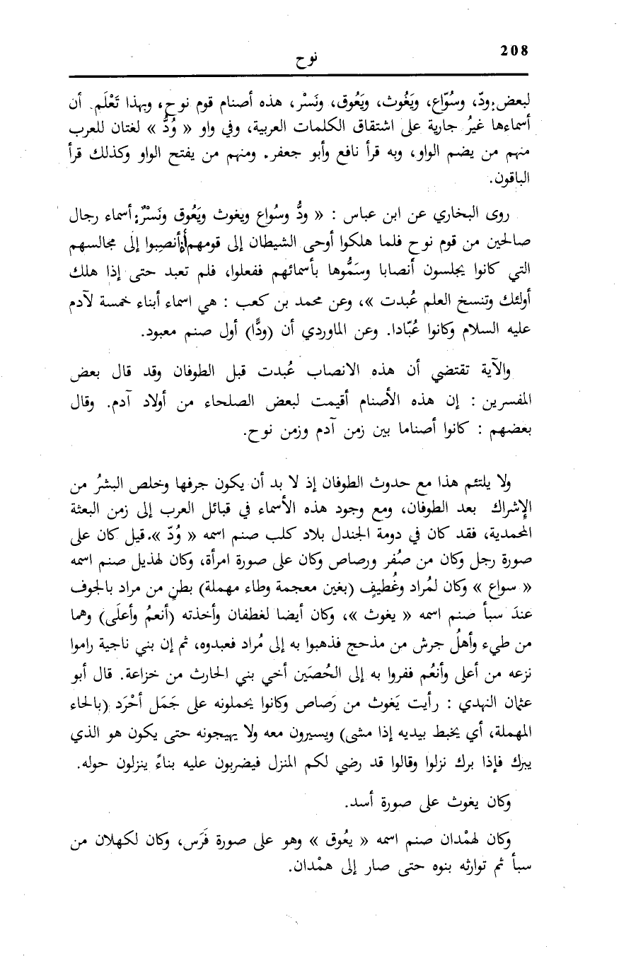 وَلَا يَلْتَئِمُ هَذَا مَعَ حُدُوثِ الطُّوفَانِ إِذْ لَا بُدَّ أَنْ يَكُونَ جَرَفَهَا وَخَلَصَ الْبَشَرُ مِنَ الْإِشْرَاكِ بَعْدَ الطُّوفَانِ، وَمَعَ وُجُودِ هَذِهِ الْأَسْمَاءِ فِي قَبَائِلِ الْعَرَبِ إِلَى زَمَنِ الْبِعْثَةِ الْمُحَمَّدِيَّةِ، فَقَدْ كَانَ فِي دَوْمَةِ الْجَنْدَلِ بِلَادِ كَلْبٍ صَنَمٌ اسْمُهُ (وَدٌّ) . قِيلَ كَانَ عَلَى صُورَةِ رَجُلٍ وَكَانَ مِنْ صُفْرٍ وَرَصَاصٍ وَكَانَ عَلَى صُورَةِ امْرَأَةٍ، وَكَانَ لِهُذَيْلٍ صَنَمٌ اسْمُهُ (سُوَاعٌ) وَكَانَ لِمُرَادٍ وَغُطَيْفٍ (بِغَيْنٍ مُعْجَمَةٍ وَطَاءٍ مُهْمَلَةٍ) بَطْنٍ مِنْ مُرَادٍ بِالْجَوْفِ عِنْدَ سَبَأٍ صَنَمٌ اسْمُهُ يَغُوثَ، وَكَانَ أَيْضًا لِغَطَفَانَ وَأَخَذَتْهُ (أَنْعُمُ وَأَعْلَى) وَهُمَا مِنْ طَيِّءٍ وَأَهْلُ جَرَشٍ مِنْ مَذْحِجٍ فَذَهَبُوا بِهِ إِلَى مُرَادٍ فَعَبَدُوهُ، ثُمَّ إِنَّ بَنِي نَاجِيَةَ رَامُوا نَزْعَهُ مِنْ أَعْلَى وَأَنْعُمَ فَفَرُّوا بِهِ إِلَى الْحُصَيْنِ أَخِي بَنِي الْحَارِثِ مِنْ خُزَاعَةَ. قَالَ أَبُو عُثْمَانَ النَّهْدِيُّ: رَأَيْتُ يَغُوثَ مِنْ رَصَاصٍ وَكَانُوا يَحْمِلُونَهُ عَلَى جَمَلٍ أَحْرَدَ (بِالْحَاءِ الْمُهْمَلَةِ، أَيْ يَخْبِطُ بِيَدَيْهِ إِذَا مَشَى) وَيَسِيرُونَ مَعَهُ وَلَا يُهَيِّجُونَهُ حَتَّى يَكُونَ هُوَ الَّذِي يَبْرُكُ فَإِذَا بَرَكَ نَزَلُوا وَقَالُوا: قَدْ رَضِيَ لَكُمُ الْمَنْزِلَ فَيَضْرِبُونَ عَلَيْهِ بِنَاءً يَنْزِلُونَ حَوْلَهُ.
