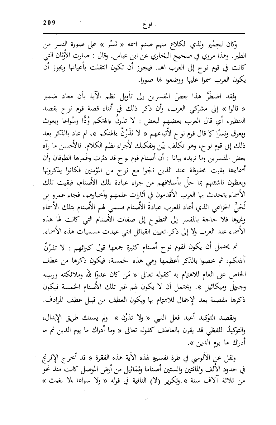 وَلَقَدِ اضْطَرَّ هَذَا بَعْضَ الْمُفَسِّرِينَ إِلَى تَأْوِيلِ نَظْمِ الْآيَةِ بِأَنَّ مُعَادَ ضَمِيرِ قالُوا إِلَى مُشْرِكِي الْعَرَبِ، وَأَنَّ ذِكْرَ ذَلِكَ فِي أَثْنَاءِ قِصَّةِ نُوحٍ بِقَصْدِ التَّنْظِيرِ، أَيْ قَالَ الْعَرَبُ بَعْضُهُمْ لِبَعْضٍ: لَا تذرنّ ءالهتكم وَدًّا وَسُوَاعًا وَيَغُوثَ وَيَعُوقُ وَنَسْرًا كَمَا قَالَ قَوْمُ نُوحٍ لِأَتْبَاعِهِمْ لَا تَذَرُنَّ آلِهَتَكُمْ، ثُمَّ عَادَ بِالذِّكْرِ بَعْدَ ذَلِكَ إِلَى قَوْمِ نُوحٍ، وَهُوَ تَكَلُّفٌ بَيِّنٌ وَتَفْكِيكٌ لِأَجْزَاءِ نَظْمِ الْكَلَامِ. فَالْأَحْسَنُ مَا رَآهُ بَعْضُ الْمُفَسِّرِينَ وَمَا نُرِيدُهُ بَيَانًا: أَنَّ أَصْنَامَ قَوْمِ نُوحٍ قَدْ دُثِرَتْ وَغَمَرَهَا الطُّوفَانُ وَأَنَّ أَسْمَاءَهَا بَقِيَتْ مَحْفُوظَةً عِنْدَ الَّذِينَ نَجَوْا مَعَ نُوحٍ مِنَ الْمُؤْمِنِينَ فَكَانُوا يَذْكُرُونَهَا وَيَعِظُونَ نَاشِئَتَهُمْ بِمَا حَلَّ بِأَسْلَافِهِمْ مِنْ جَرَّاءِ عِبَادَةِ تِلْكَ الْأَصْنَامِ، فَبَقِيَتْ تِلْكَ الْأَسْمَاءُ يَتَحَدَّثُ بِهَا الْعَرَبُ الْأَقْدَمُونَ فِي أَثَارَاتِ عِلْمِهِمْ وَأَخْبَارِهِمْ، فَجَاءَ عَمْرُو بْنُ لُحَيٍّ الْخُزَاعِيُّ الَّذِي أَعَادَ لِلْعَرَبِ عِبَادَةَ الْأَصْنَامِ فَسَمَّى لَهُمُ الْأَصْنَامَ بِتِلْكَ الْأَسْمَاءِ وَغَيْرِهَا فَلَا حَاجَةَ بِالْمُفَسِّرِ إِلَى التَّطَوُّحِ إِلَى صِفَاتِ الْأَصْنَامِ الَّتِي كَانَتْ لَهَا هَذِهِ الْأَسْمَاءُ عِنْدَ الْعَرَبِ وَلَا إِلَى ذِكْرِ تَعْيِينِ الْقَبَائِلِ الَّتِي عَبَدَتْ مُسَمَّيَاتِ هَذِهِ الْأَسْمَاءِ.
