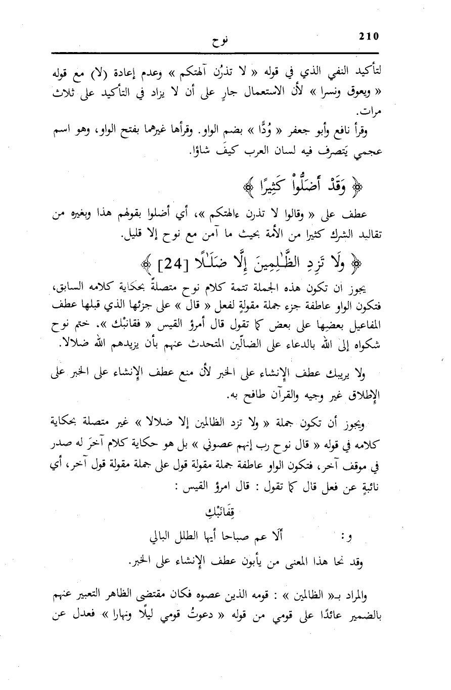 وَيَجُوزُ أَنْ تَكُونَ جُمْلَةُ وَلا تَزِدِ الظَّالِمِينَ إِلَّا ضَلالًا غَيْرَ مُتَّصِلَةٍ بِحِكَايَةِ كَلَامِهِ فِي قَوْلِهِ: قالَ نُوحٌ رَبِّ إِنَّهُمْ عَصَوْنِي [نوح: 21] بَلْ هُوَ حِكَايَةُ كَلَامٍ آخَرَ لَهُ صَدْرٌ فِي مَوْقِفٍ آخَرَ، فَتَكُونُ الْوَاوُ عَاطِفَةً جُمْلَةَ مَقُولَةِ قَوْلٍ عَلَى جُمْلَةِ مَقُولَةِ قَوْلٍ آخَرَ، أَيْ نَائِبَةٍ عَنْ فِعْلِ قَالَ كَمَا تَقُولُ: قَالَ امْرُؤ الْقَيْس: