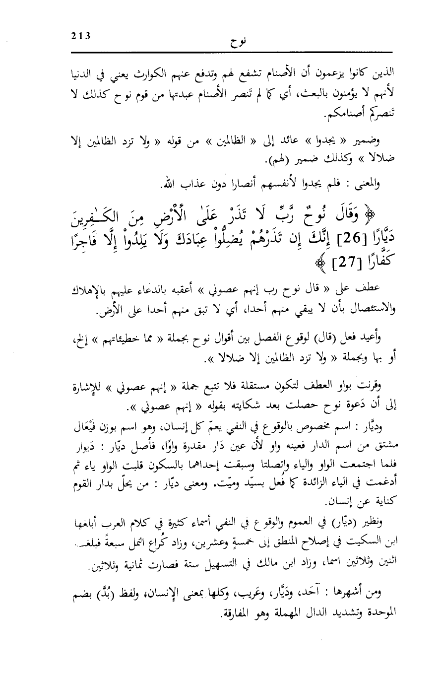 وَقالَ نُوحٌ رَبِّ لَا تَذَرْ عَلَى الْأَرْضِ مِنَ الْكافِرِينَ دَيَّاراً (26) إِنَّكَ إِنْ تَذَرْهُمْ يُضِلُّوا عِبادَكَ وَلا يَلِدُوا إِلاَّ فاجِراً كَفَّاراً (27)