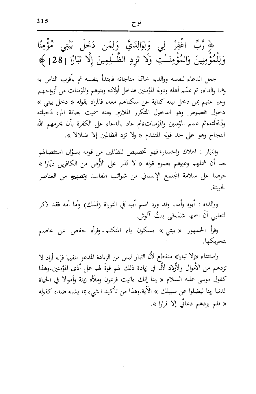 رَبِّ اغْفِرْ لِي وَلِوالِدَيَّ وَلِمَنْ دَخَلَ بَيْتِيَ مُؤْمِناً وَلِلْمُؤْمِنِينَ وَالْمُؤْمِناتِ وَلا تَزِدِ الظَّالِمِينَ إِلاَّ تَباراً (28)