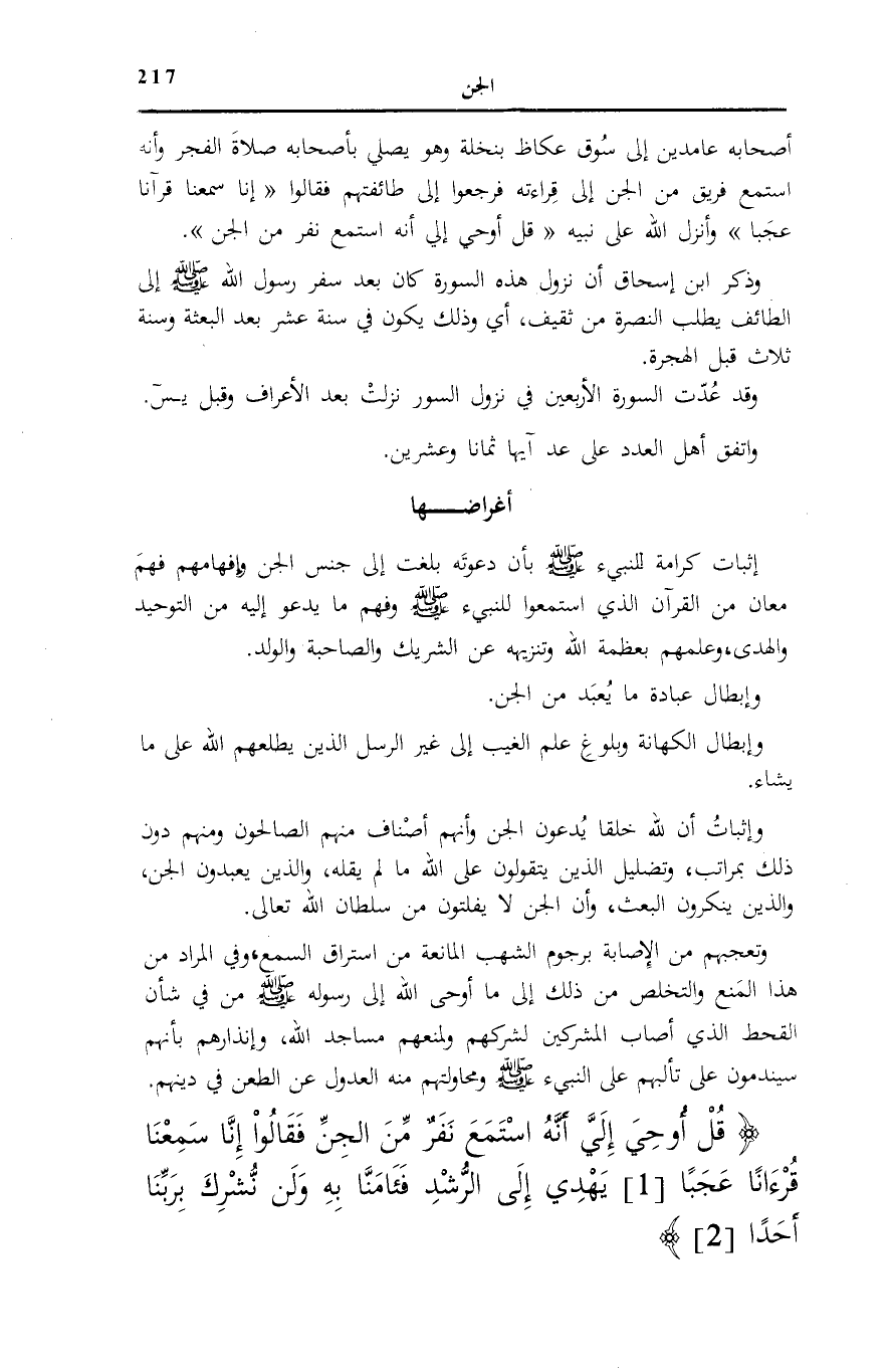 قُلْ أُوحِيَ إِلَيَّ أَنَّهُ اسْتَمَعَ نَفَرٌ مِنَ الْجِنِّ فَقالُوا إِنَّا سَمِعْنا قُرْآناً عَجَباً (1) يَهْدِي إِلَى الرُّشْدِ فَآمَنَّا بِهِ وَلَنْ نُشْرِكَ بِرَبِّنا أَحَداً