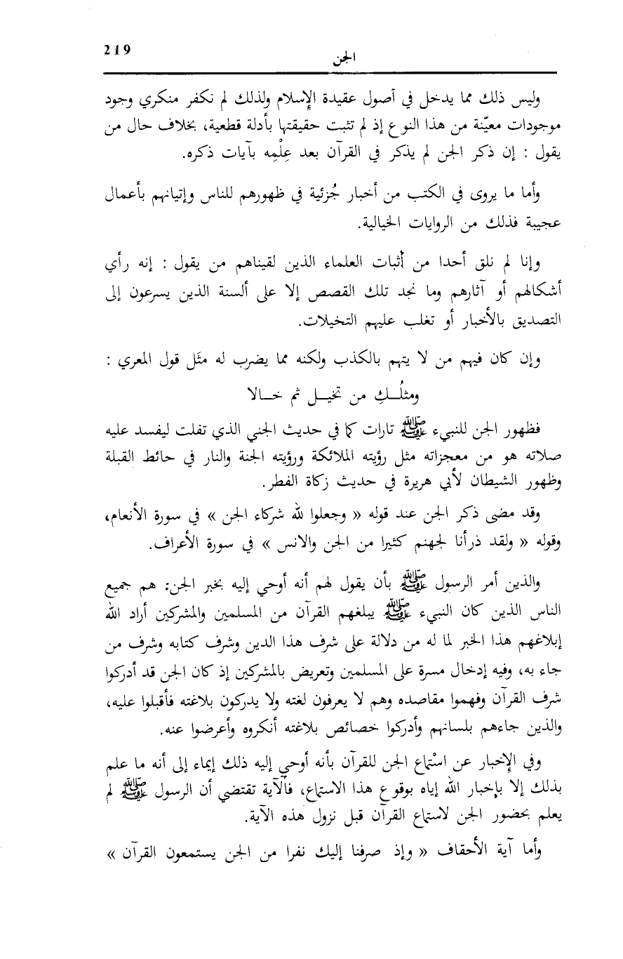 وَلَيْسَ ذَلِكَ مِمَّا يَدْخُلُ فِي أُصُولِ عَقِيدَةِ الْإِسْلَامِ وَلِذَلِكَ لَمْ نُكَفِّرْ مُنْكِرِي وُجُودِ مَوْجُودَاتٍ مُعَيَّنَةٍ مِنْ هَذَا النَّوْعِ إِذْ لَمْ تَثْبُتْ حَقِيقَتُهَا بِأَدِلَّةٍ قَطْعِيَّةٍ، بِخِلَافِ حَالِ مَنْ يَقُولُ: إِنَّ ذِكْرَ الْجِنِّ لَمْ يُذْكَرْ فِي الْقُرْآنِ بَعْدَ عِلْمِهِ بِآيَاتِ ذِكْرِهِ.