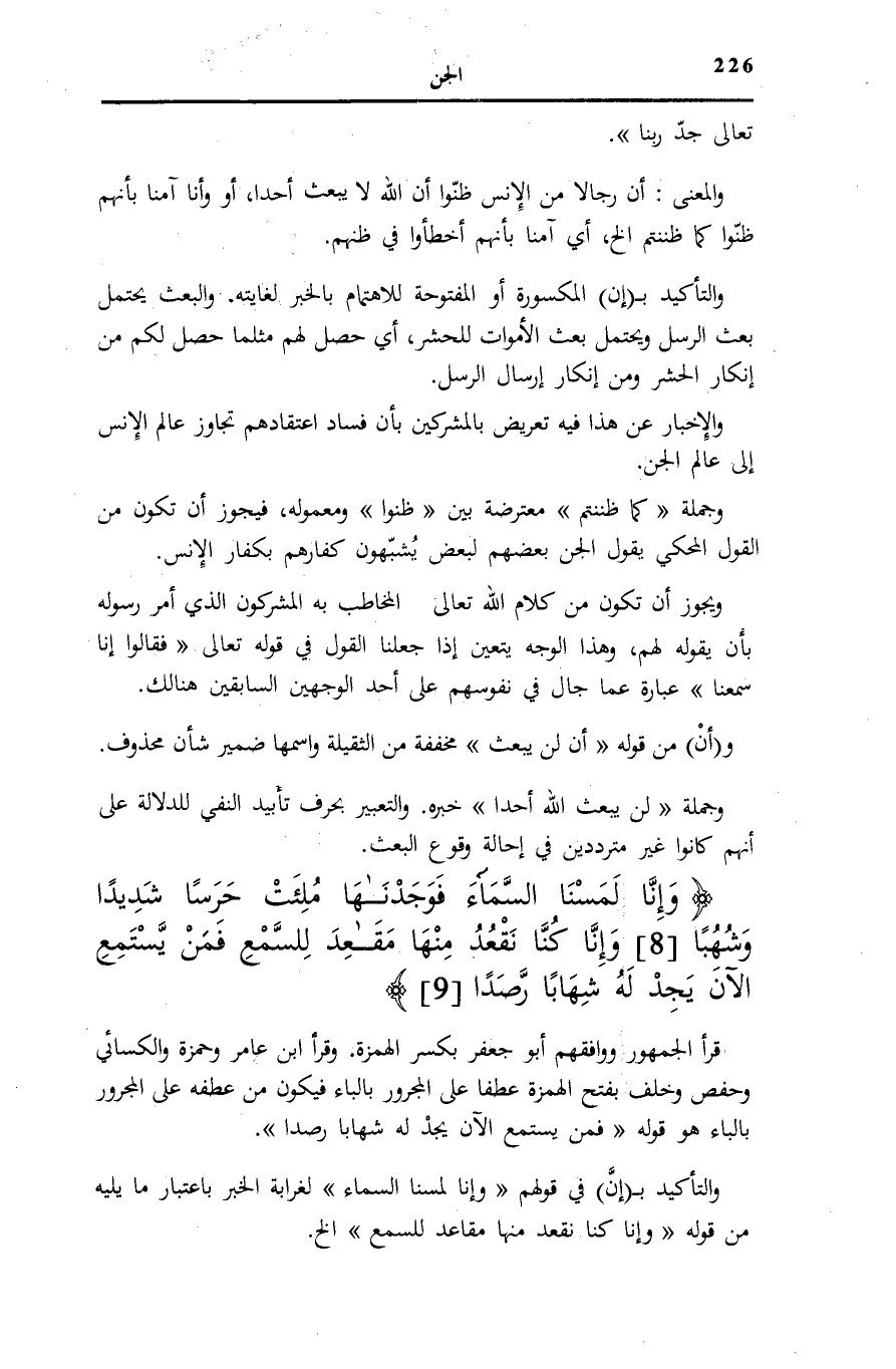 وَيَجُوزُ أَنْ تَكُونَ مِنْ كَلَامِ اللَّهِ تَعَالَى الْمُخَاطَبِ بِهِ الْمُشْرِكُونَ الَّذِي أَمَرَ رَسُولَهُ بِأَنْ يَقُولَهُ لَهُمْ، وَهَذَا الْوَجْهُ يَتَعَيَّنُ إِذَا جَعَلْنَا الْقَوْلَ فِي قَوْلِهِ تَعَالَى: فَقالُوا إِنَّا سَمِعْنا [الْجِنّ: