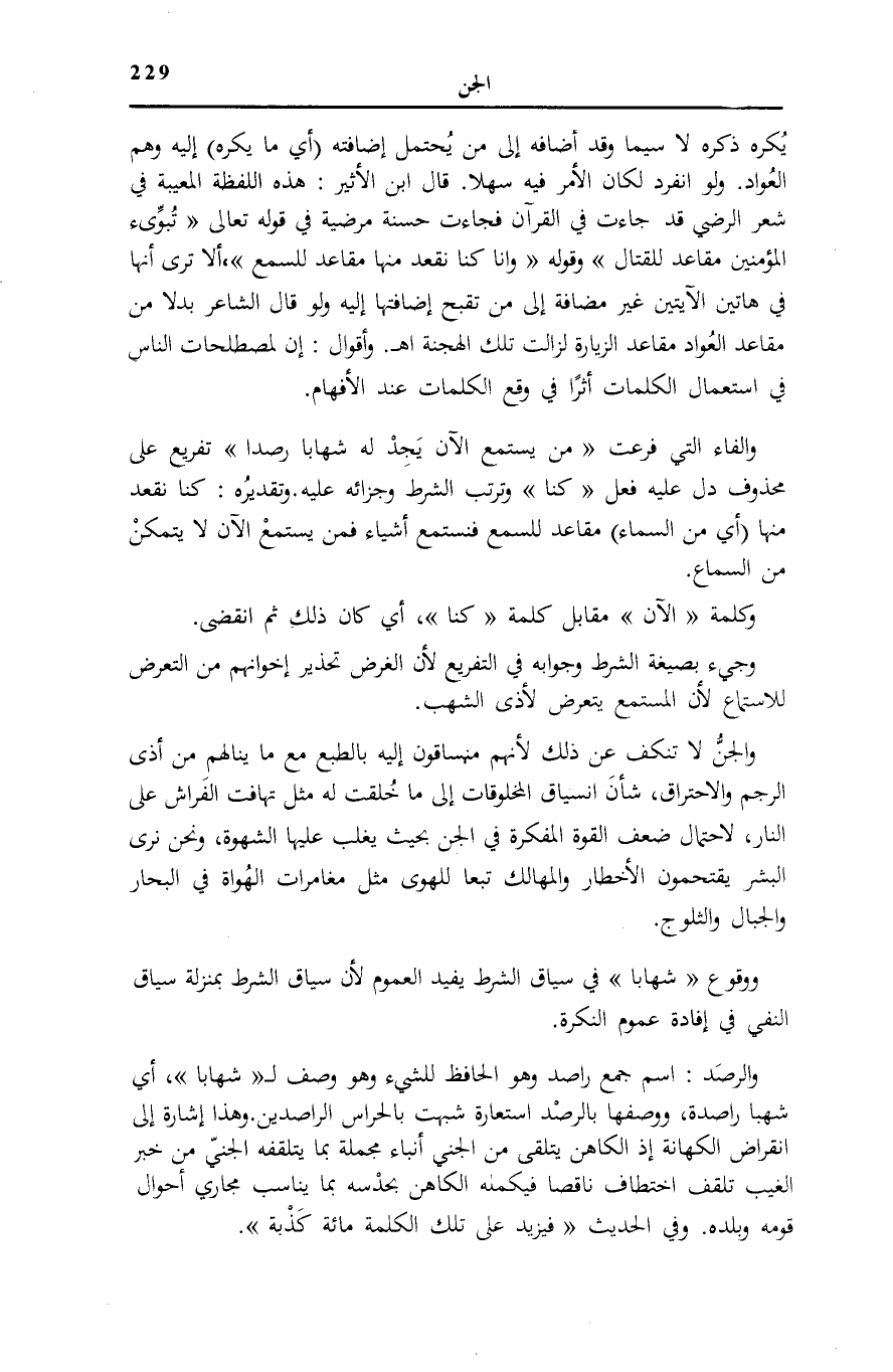 وَالْفَاءُ الَّتِي فُرِّعَتْ فَمَنْ يَسْتَمِعِ الْآنَ يَجِدْ لَهُ شِهاباً رَصَداً تَفْرِيعٌ عَلَى مَحْذُوفٍ دَلَّ عَلَيْهِ فِعْلُ كُنَّا وترتب الشَّرْط وجزائه عَلَيْهِ وَتَقْدِيرُهُ: كُنَّا نَقْعُدُ مِنْهَا (أَيْ مِنَ السَّمَاءِ) مَقَاعِدَ لِلسَّمْعِ فَنَسْتَمِعُ أَشْيَاءَ فَمَنْ يَسْتَمِعُ الْآنَ لَا يَتَمَكَّنُ مِنَ السَّمَاعِ.
