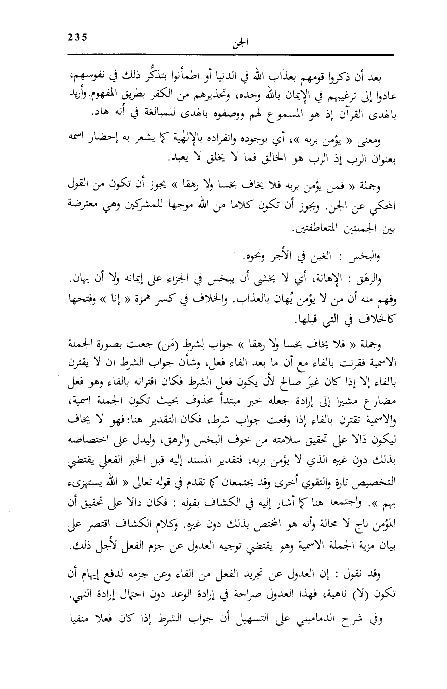 وَجُمْلَةُ فَمَنْ يُؤْمِنْ بِرَبِّهِ فَلا يَخافُ بَخْساً وَلا رَهَقاً يَجُوزُ أَنْ تَكُونَ مِنَ الْقَوْلِ الْمَحْكِيِّ عَنِ الْجِنِّ. وَيَجُوزُ أَنْ تَكُونَ كَلَامًا مِنَ اللَّهِ مُوَجَّهًا لِلْمُشْرِكِينَ وَهِيَ مُعْتَرِضَةٌ بَيْنَ الْجُمْلَتَيْنِ الْمُتَعَاطِفَتَيْنِ.