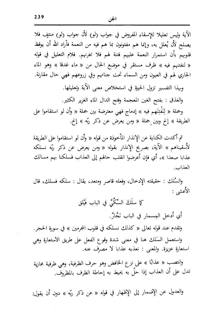 الْآيَةِ وَلَيْسَ تَعْلِيلًا لِلْإِسْقَاءِ الْمَفْرُوضِ فِي جَوَابِ لَوِ لَأَنَّ جَوَابَ لَوِ مُنْتَفٍ فَلَا يَصْلُحُ لَأَنْ يُعَلَّلَ بِهِ، وَإِنَّمَا هُمْ مَفْتُونُونَ بِمَا هُمْ فِيهِ مِنَ النِّعْمَةِ فَأَرَادَ اللَّهُ أَنْ يُوقِظَ قُلُوبَهُمْ بِأَنَّ اسْتِمْرَارَ النِّعْمَةِ عَلَيْهِمْ فِتْنَةٌ لَهُمْ فَلَا تَغُرَّنَّهُمْ. فَلَامُ التَّعْلِيلِ فِي قَوْلِهِ: لِنَفْتِنَهُمْ فِيهِ ظَرْفٌ مُسْتَقِرٌّ فِي مَوْضِعِ الْحَالِ مِنْ مَاءً غَدَقاً وَهُوَ الْمَاءُ الْجَارِي لَهُمْ فِي الْعُيُونِ وَمِنَ السَّمَاءِ تَحْتَ جَنَّاتِهِمْ وَفِي زُرُوعِهِمْ فَهِيَ حَالٌ مُقَارَنَةٌ.