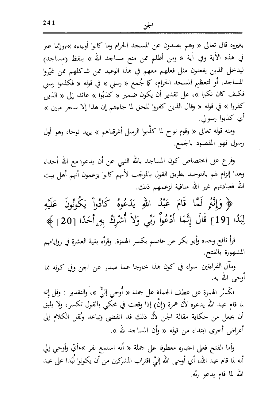 فَكَسْرُ الْهَمْزَةِ عَلَى عَطْفِ الْجُمْلَةِ عَلَى جُمْلَةِ أُوحِيَ إِلَيَّ [الْجِنّ: 1] ، وَالتَّقْدِيرُ: وَقُلْ إِنَّهُ لَمَّا قَامَ عَبْدُ اللَّهِ يَدْعُوهُ لِأَنَّ هَمْزَةَ (إِنَّ) إِذَا وَقَعَتْ فِي مَحْكِيٍّ بِالْقَوْلِ تُكْسَرُ، وَلَا يَلِيقُ أَنْ يُجْعَلَ مِنْ حِكَايَةِ مَقَالَةِ الْجِنِّ لِأَنَّ ذَلِكَ قَدِ انْقَضَى وَتَبَاعَدَ وَنُقِلَ الْكَلَامُ إِلَى أَغْرَاضٍ أُخْرَى ابْتِدَاءً مِنْ قَوْلِهِ: وَأَنَّ الْمَساجِدَ لِلَّهِ [الْجِنّ: 18] .