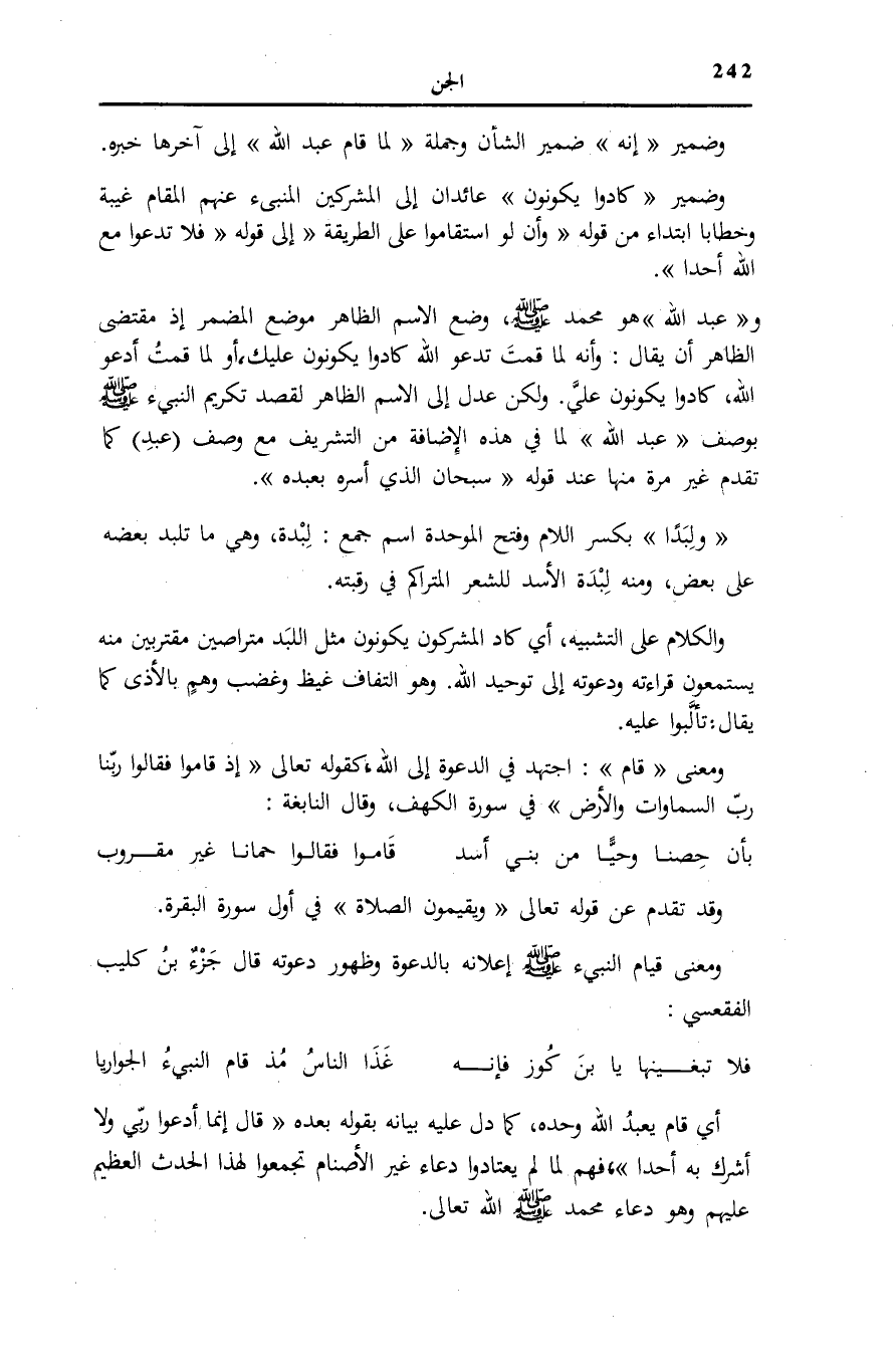 وعَبْدُ اللَّهِ هُوَ مُحَمَّدٌ صَلَّى اللهُ عَلَيْهِ وَسَلَّمَ. وُضِعُ الِاسْمُ الظَّاهِرُ مَوْضِعَ الْمُضْمَرِ إِذْ مُقْتَضَى الظَّاهِرِ أَنْ يُقَالَ: وَأَنَّهُ لَمَّا قُمْتَ تَدْعُو اللَّهَ كَادُوا يَكُونُونَ عَلَيْكَ، أَوْ لَمَّا قُمْتُ أَدْعُو اللَّهَ، كَادُوا يَكُونُونَ عَلَيَّ. وَلَكِنْ عُدِلَ إِلَى الِاسْمِ الظَّاهِرِ لِقَصْدِ تَكْرِيمِ النَّبِيءِ صَلَّى اللهُ عَلَيْهِ وَسَلَّمَ بِوَصْفِ عَبْدُ اللَّهِ لِمَا فِي هَذِهِ الْإِضَافَةِ مِنَ التَّشْرِيفِ مَعَ وَصْفِ عَبْدُ كَمَا تَقَدَّمَ غَيْرَ مَرَّةٍ مِنْهَا عِنْدَ قَوْلِهِ: