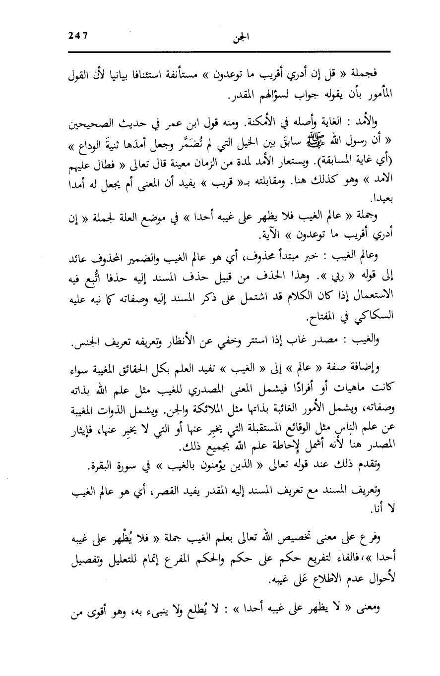 وَإِضَافَةُ صِفَةِ عالِمُ إِلَى الْغَيْبِ تُفِيدُ الْعِلْمَ بِكُلِّ الْحَقَائِقِ الْمُغَيَّبَةِ سَوَاءٌ كَانَتْ مَاهِيَّاتٍ أَوْ أَفْرَادًا فَيَشْمَلُ الْمَعْنَى الْمَصْدَرِيَّ لِلْغَيْبِ مِثْلَ عِلْمِ اللَّهِ بِذَاتِهِ وَصِفَاتِهِ، وَيَشْمَلُ الْأُمُورَ الْغَائِبَةَ بِذَاتِهَا مِثْلَ الْمَلَائِكَةِ وَالْجِنِّ. وَيَشْمَلُ الذَّوَاتِ الْمُغَيَّبَةِ عَنْ عِلْمِ النَّاسِ مِثْلَ الْوَقَائِعِ الْمُسْتَقْبَلَةِ الَّتِي يُخْبَرُ عَنْهَا أَوِ الَّتِي لَا يُخْبَرُ عَنْهَا، فَإِيثَارُ الْمَصْدَرِ هُنَا لِأَنَّهُ أشمل لِإِحَاطَةِ عِلْمِ اللَّهِ بِجَمِيعِ ذَلِكَ.