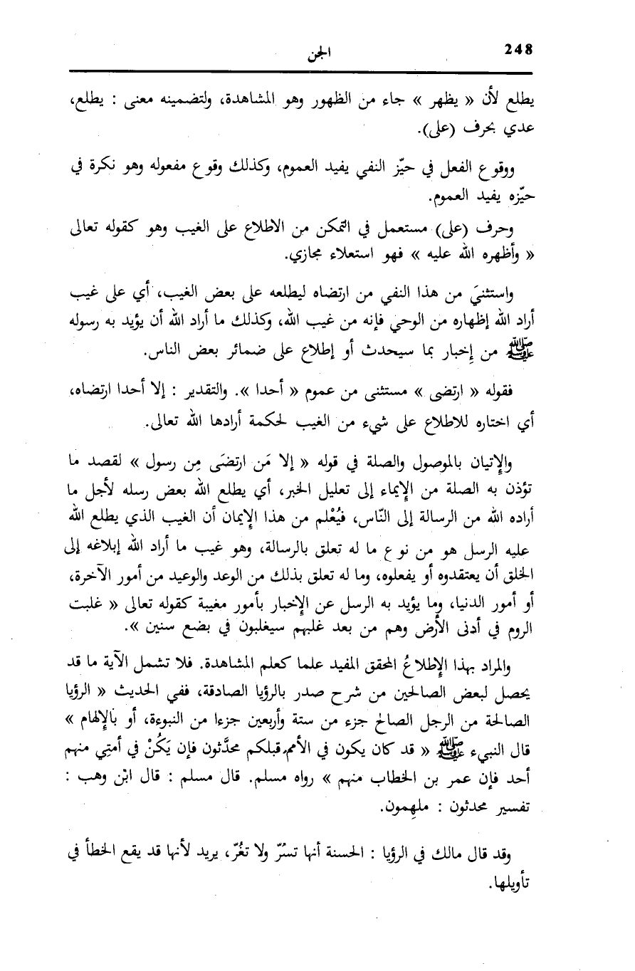 وَالْمُرَادُ بِهَذَا الْإِطْلَاعُ الْمُحَقَّقُ الْمُفِيدُ عِلْمًا كَعِلْمِ الْمُشَاهَدَةِ. فَلَا تَشْمَلُ الْآيَةُ مَا قَدْ يَحْصُلُ لِبَعْضِ الصَّالِحِينَ مِنْ شَرْحِ صَدْرٍ بِالرُّؤْيَا الصَّادِقَةِ،