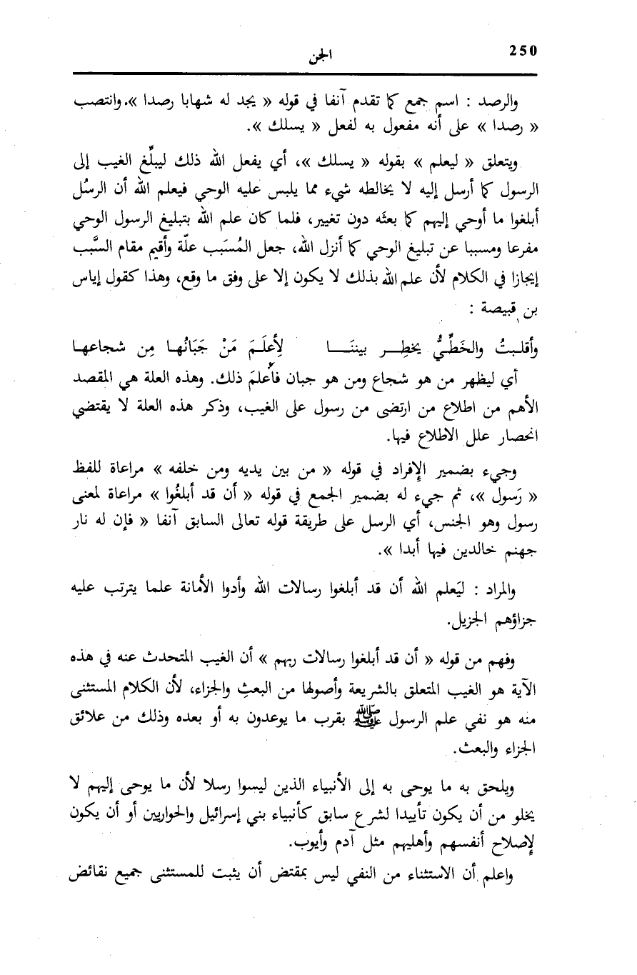 وَفُهِمَ مِنْ قَوْلِهِ: أَنْ قَدْ أَبْلَغُوا رِسالاتِ رَبِّهِمْ أَنَّ الْغَيْبَ الْمُتَحَدَّثَ عَنْهُ فِي هَذِهِ الْآيَةَ هُوَ الْغَيْبُ الْمُتَعَلِّقُ بِالشَّرِيعَةِ وَأُصُولِهَا مِنَ الْبَعْثِ وَالْجَزَاءِ، لِأَنَّ الْكَلَامَ الْمُسْتَثْنَى مِنْهُ هُوَ نَفْيُ عِلْمِ الرَّسُولِ صَلَّى اللهُ عَلَيْهِ وَسَلَّمَ بِقُرْبِ مَا يُوعَدُونَ بِهِ أَوْ بَعْدَهُ وَذَلِكَ مِنْ عَلَائِقِ الْجَزَاءِ وَالْبَعْثِ.