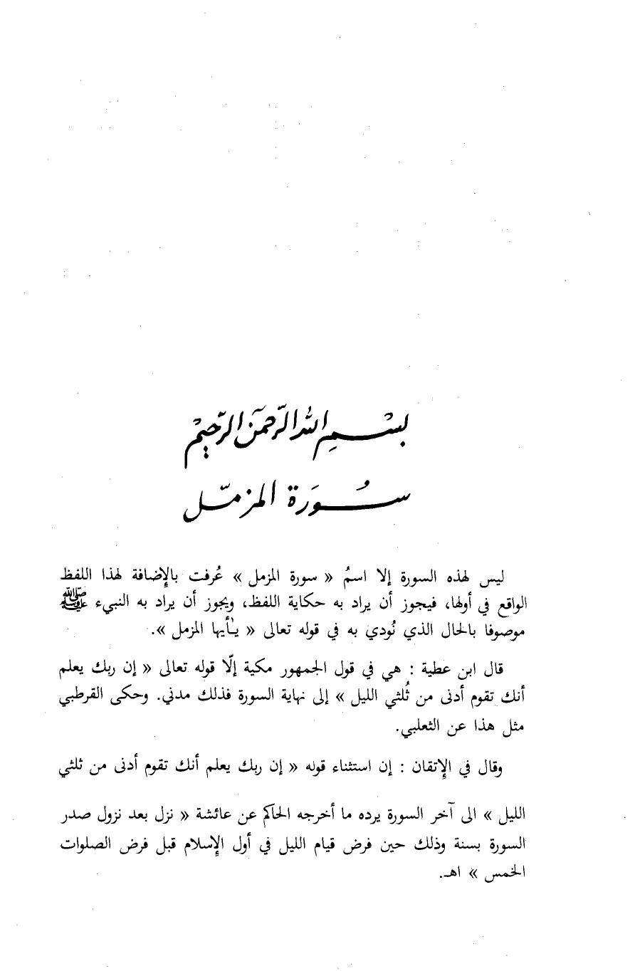 وَقَالَ فِي «الْإِتْقَانِ» : إِنَّ اسْتِثْنَاءَ قَوْلِهِ: إِنَّ رَبَّكَ يَعْلَمُ أَنَّكَ تَقُومُ أَدْنى مِنْ ثُلُثَيِ اللَّيْلِ إِلَى آخِرِ السُّورَةِ يَرُدُّهُ مَا أَخْرَجَهُ الْحَاكِمُ عَنْ عَائِشَةَ «نَزَلَ بَعْدَ نُزُولِ صَدْرِ السُّورَةِ بِسَنَةٍ وَذَلِكَ حِينَ فُرِضَ قِيَامُ اللَّيْلِ فِي أَوَّلِ الْإِسْلَامِ قَبْلَ فَرْضِ الصَّلَوَاتِ الْخَمْسِ» اهـ.