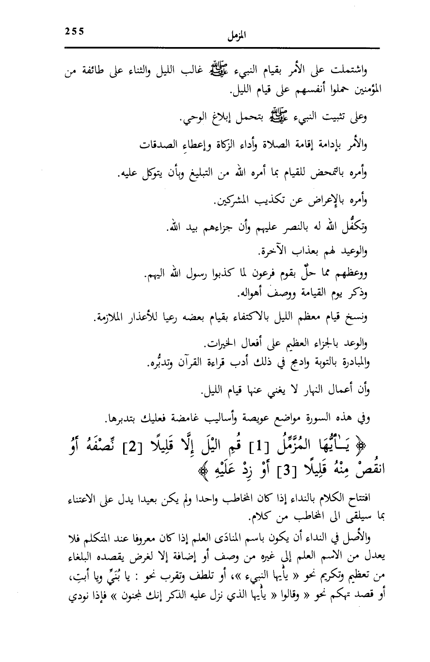 وَاشْتَمَلَتْ عَلَى الْأَمْرِ بِقِيَامِ النَّبِيءِ صَلَّى اللهُ عَلَيْهِ وَسَلَّمَ غَالِبَ اللَّيْلِ وَالثَّنَاءِ عَلَى طَائِفَةٍ مِنَ الْمُؤْمِنِينَ حَمَلُوا أَنْفُسَهُمْ عَلَى قِيَامِ اللَّيْلِ.