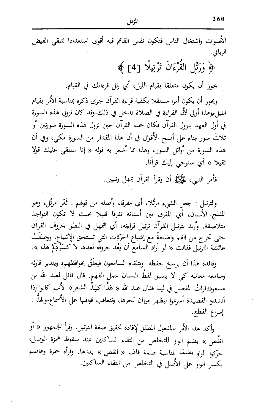 وَيَجُوزُ أَنْ يَكُونَ أَمْرًا مُسْتَقِلًّا بِكَيْفِيَّةِ قِرَاءَةِ الْقُرْآنِ جَرَى ذِكْرُهُ بِمُنَاسَبَةِ الْأَمْرِ بِقِيَامِ اللَّيْلِ، وَهَذَا أَوْلَى لِأَنَّ الْقِرَاءَةَ فِي الصَّلَاةِ تَدْخُلُ فِي ذَلِكَ. وَقَدْ كَانَ نُزُولُ هَذِهِ السُّورَةِ فِي أَوَّلِ الْعَهْدِ بِنُزُولِ الْقُرْآنِ فَكَانَ جُمْلَةُ الْقُرْآنِ حِينَ نُزُولِ هَذِهِ السُّورَةِ سُورَتَيْنِ أَوْ ثَلَاثِ سُوَرٍ بِنَاءً عَلَى أَصَحِّ الْأَقْوَالِ فِي أَنَّ هَذَا الْمِقْدَارَ مِنَ السُّورَةِ مَكِّيٌّ، وَفِي أَنَّ هَذِهِ السُّورَةَ مِنْ أَوَائِلِ السُّوَرِ، وَهَذَا مِمَّا أَشْعَرَ بِهِ قَوْلُهُ: إِنَّا سَنُلْقِي عَلَيْكَ قَوْلًا ثَقِيلًا [المزمل: 5] أَيْ سَنُوحِي إِلَيْكَ قُرْآنًا.