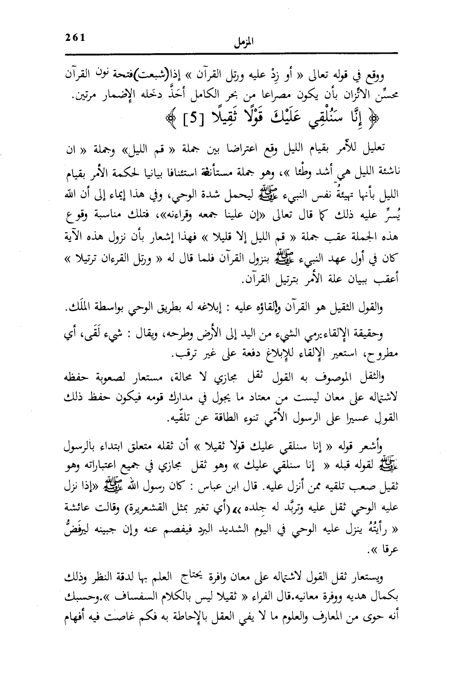 وَأَشْعَرَ قَوْلُهُ: إِنَّا سَنُلْقِي عَلَيْكَ قَوْلًا ثَقِيلًا أَنَّ ثِقَلَهُ مُتَعَلِّقٌ ابْتِدَاءً بِالرَّسُولِ صَلَّى اللهُ عَلَيْهِ وَسَلَّمَ لِقَوْلِهِ قَبْلَهُ: إِنَّا سَنُلْقِي عَلَيْكَ وَهُوَ ثِقَلٌ مَجَازِيٌّ فِي جَمِيعِ اعْتِبَارَاتِهِ وَهُوَ ثَقِيلٌ صَعْبٌ تَلَقِّيهِ مِمَّنْ أَنْزَلَ عَلَيْهِ.